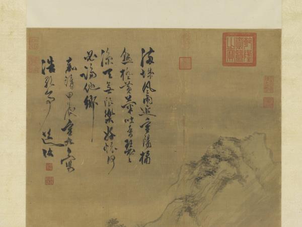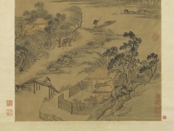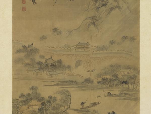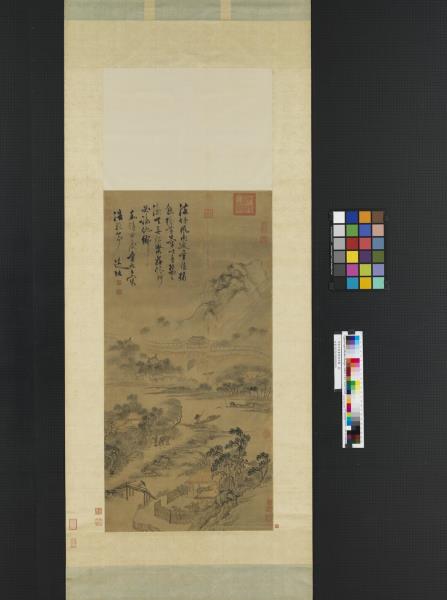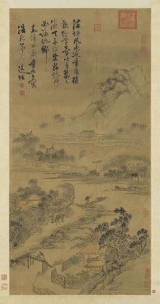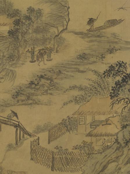 Using fluid and relaxed brushwork, the artist has depicted a scene on the ninth day of the ninth month (“Double Ninth”). Chrysanthemums fully bloom along a stream on the city outskirts; fishermen and travelers go about their business despite the slanting rain. These images reiterate the theme of the poem at the top of the painting: “The Double Ninth draws upon the storm-drenched town; oranges ripen golden, chrysanthemums their scent abound.” This painting was done in 1544, the year of the artist’s death.