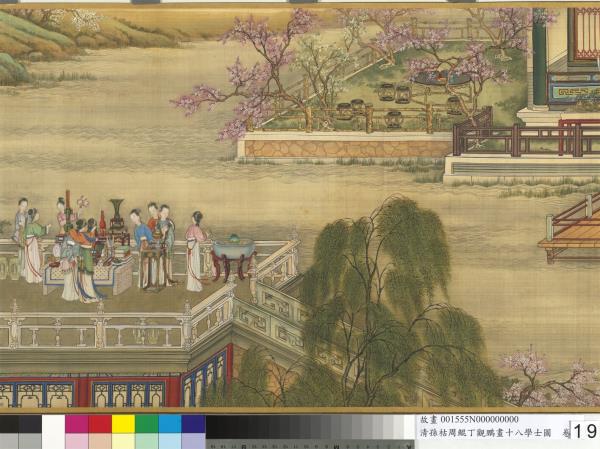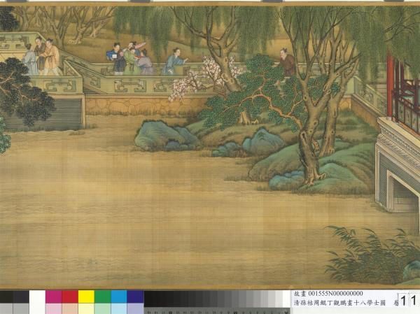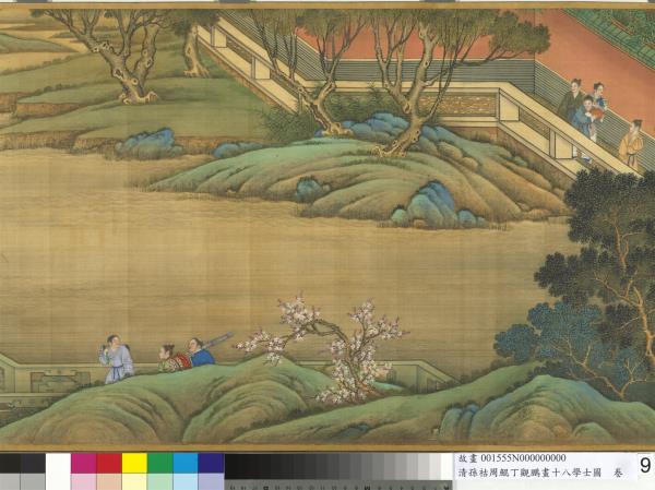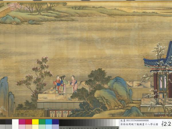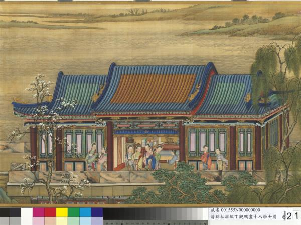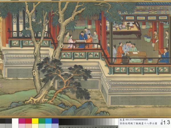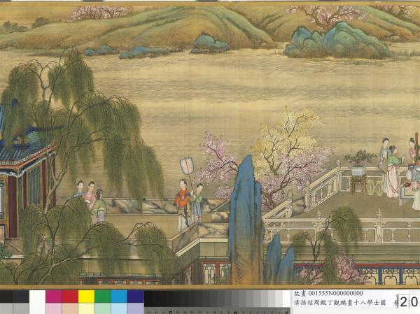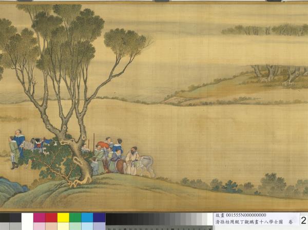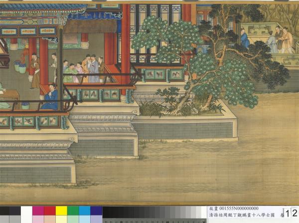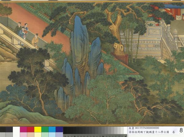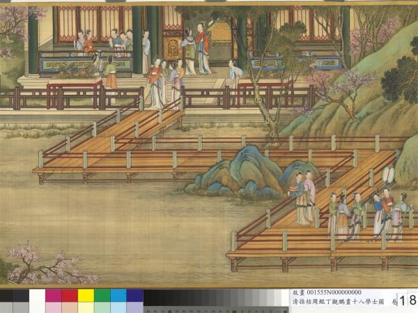 唐太宗起文學館,收聘賢才。以杜如晦、房玄齡、于志寧、蘇世長、薛收、褚亮、姚思廉、陸明德、孔穎達、李道玄、李守素、虞世南、蔡允恭、顏相時、許敬宗、薛元敬、蓋文達、蘇勖等十八人,並為學士。旋收卒,復召劉孝孫補之。嘗命閻立本圖像,褚亮為贊。後人仿作者甚多。此卷成於乾隆辛酉年(一七四一)十二月,孫、周、丁三名宮廷畫師奉制合筆。設色穠艷,追摹光影,已受西法影響。