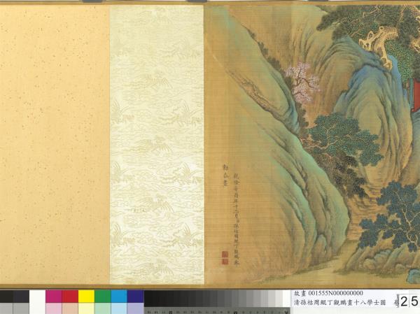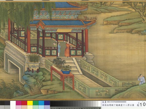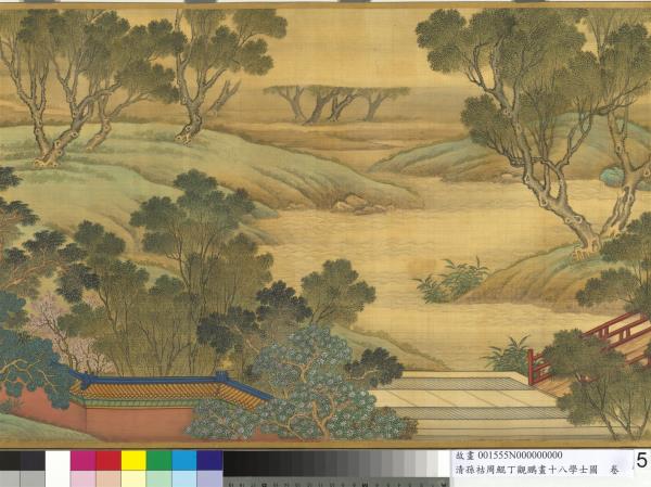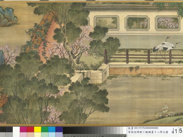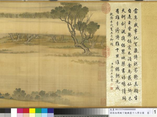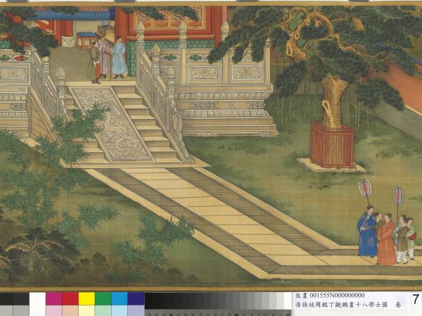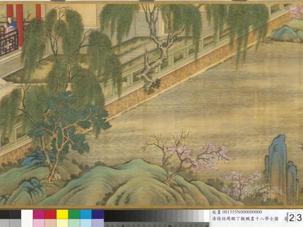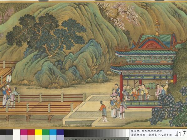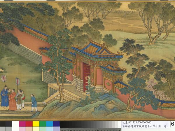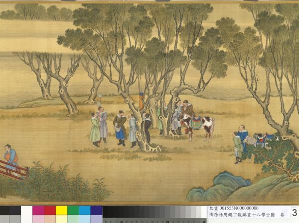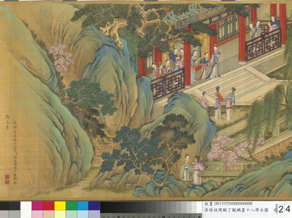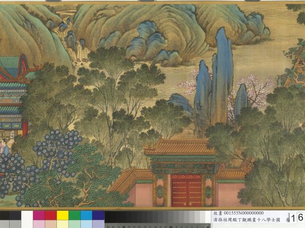 唐太宗起文學館,收聘賢才。以杜如晦、房玄齡、于志寧、蘇世長、薛收、褚亮、姚思廉、陸明德、孔穎達、李道玄、李守素、虞世南、蔡允恭、顏相時、許敬宗、薛元敬、蓋文達、蘇勖等十八人,並為學士。旋收卒,復召劉孝孫補之。嘗命閻立本圖像,褚亮為贊。後人仿作者甚多。此卷成於乾隆辛酉年(一七四一)十二月,孫、周、丁三名宮廷畫師奉制合筆。設色穠艷,追摹光影,已受西法影響。