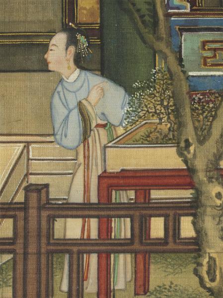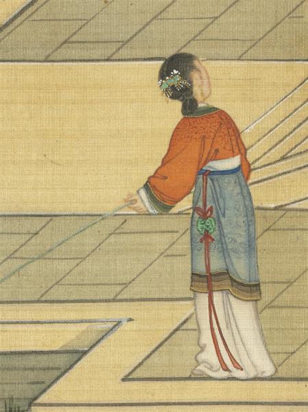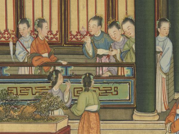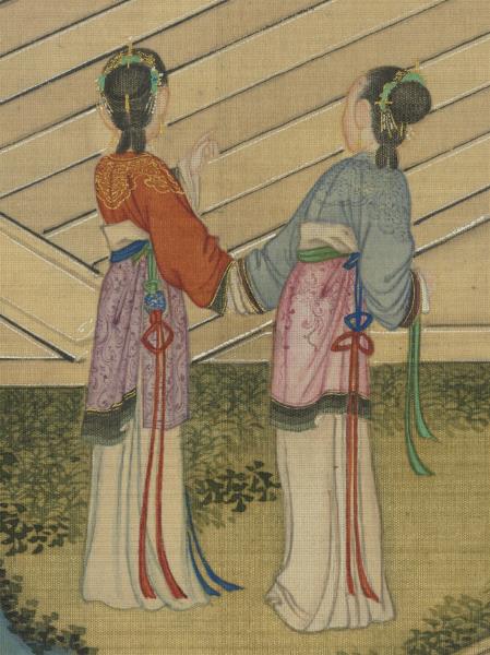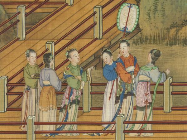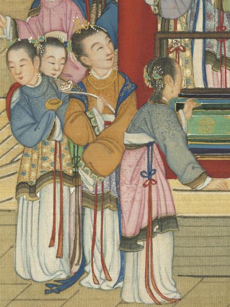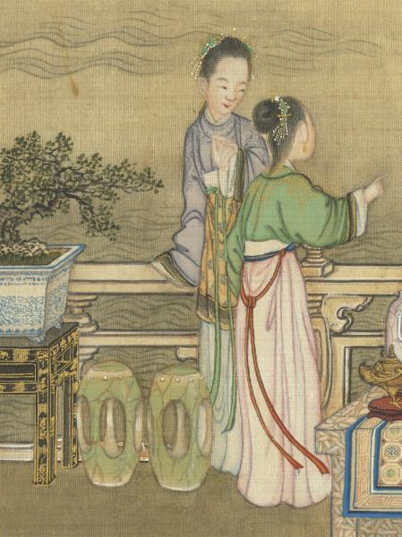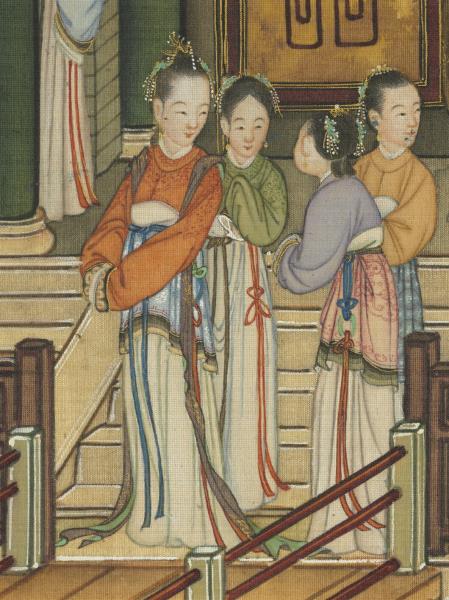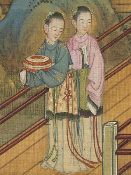 When the T’ang emperor T’ai-tsung (r.627-649) established the Academy of Learning, and he invited 18 talented scholars to serve there. The famous T’ang artist Yen Li-pen (ca. 600-674) was commissioned to depict them and Chu Liang wrote an encomium listing their names and ranks. Later artists often made copies of Yen’s version. This painting was done in the 12th lunar month of 1741 by Sun Hu, Chou K’un, and Ting Kuan-p’eng, who served as court artists under the Ch’ien-lung emperor (r.1736-1795). The coloring is vibrant, while the shading here already reflects the influence of Western techniques.