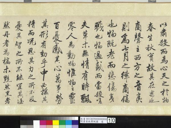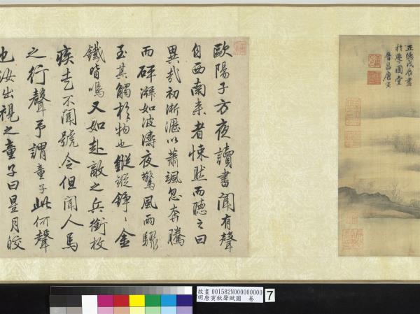 歐陽子方夜讀書。聞有聲自西南來者。悚然而聽之曰。異哉。初淅瀝以蕭颯。忽奔騰而砰湃。如波濤夜驚。風雨驟至。其觸於物也。鏦鏦錚錚。金鐵皆鳴。又如赴敵之兵。銜枚疾走。不聞號令。但聞人馬之行聲。予謂童子。此何聲也。汝出視之。童子曰。星月皎潔。明河在天。四無人聲。聲在樹間。予曰。噫嘻悲哉。此秋聲也。胡為乎來哉。蓋夫秋之為狀也。其色慘澹。烟霏雲斂。其容清明。天高日晶。其氣懍冽。砭人肌骨。其意蕭條。山川寂寥。故其為聲也。淒淒切切。呼號奮發。豐草綠縟而爭先(點去)茂。佳木蔥蘢而可悅。草拂之而色變。木遭之而葉脫。其所以摧敗零落者。乃一氣之餘烈。夫秋刑官也。於時為陰。又兵象也。於行為金。是謂天地之義氣。常以肅殺而為心。天之於物。春生秋實。故其在樂也。商聲主西方之音。夷則為七月之律商。傷也。物既老而悲傷。夷戮也。物過盛而當殺。嗟夫。草木無情。有時飄零。人為動物。惟物之靈。百憂感其心。萬事勞其形。有動乎中。必搖其精。而況思其力之所不及。憂其智之所不能。宜其渥然丹者為槁木。黟然黑者為星星。奈何非金石之質。欲與草木而爭榮。念誰為之戕賦。亦何恨乎秋聲。童子莫對。垂頭而睡。但聞四壁蟲聲唧唧。如助余之嘆息。蘇臺唐寅書於學圃堂。 |