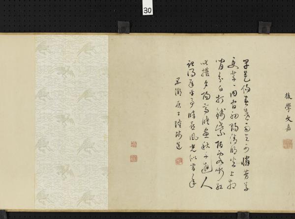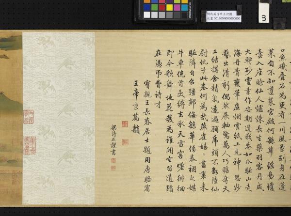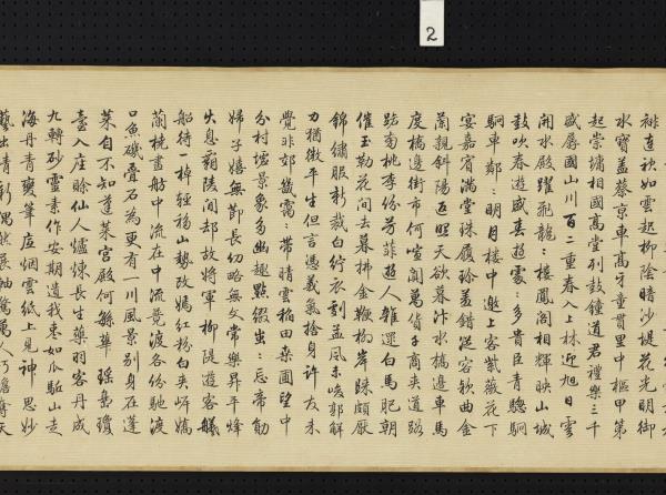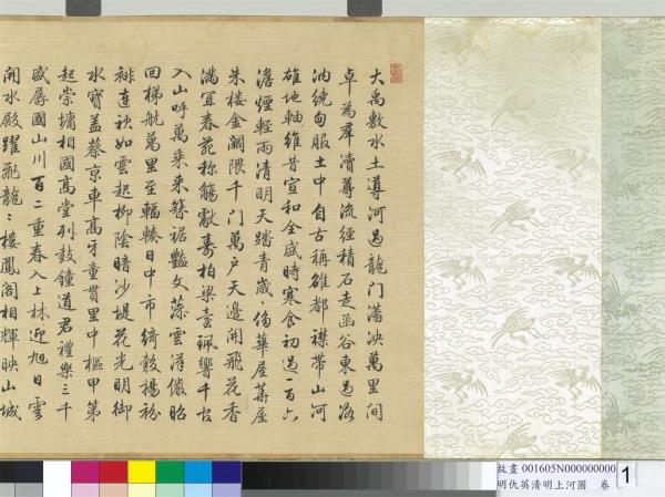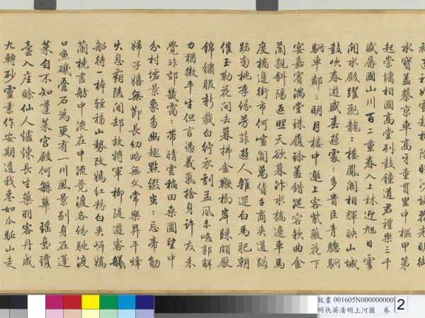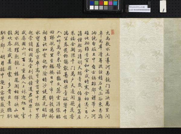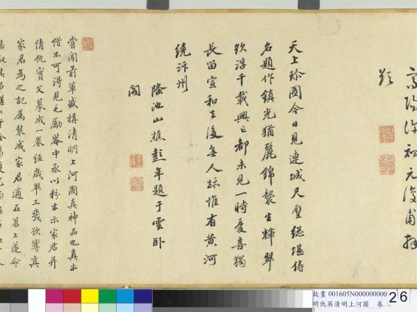 大禹敷水土。導河過龍門。漭泱萬里間。卓為群瀆尊。流經積石走函谷。東過洛汭繞甸服。土中自古稱雒都。襟帶山河雄地軸。維昔宣和全盛時。寒食初過一百六。澹煙輕雨清明天。踏青歲歲侈華屋。華屋朱樓金闕隈。千門萬戶天邊開。飛花香滿宜春苑。稱觴獻壽柏梁臺。珮響千官入。山呼萬乘來。簪裾艷文藻。雲漢儼昭回。梯航萬里至。輻輳日中市。綺縠揚衯裶。連袂如雲起。柳陰暗沙隄。花光明御水。寶蓋蔡京車。高牙童貫里。中樞甲第起崇墉。相國高堂列鼓鐘。道君禮樂三千盛。孱國山川百二重。春入上林迎旭日。雲開水殿躍飛龍。龍樓鳳閣相輝映。山城鼓吹春遊盛。春遊處處多貴臣。青驄駉駉車鄰鄰。明月樓中邀上客。紫薇花下宴嘉賓。滿堂珠履珍羞錯。從容款曲金蘭親。斜陽返照天欲暮。汴水橋邊車馬度。橋邊街市何喧闐。萬貨千商夾道路。路旁桃李紛芳菲。遊人雜遝白馬肥。朝催玉勒花間去。暮拂金鞭柳岸歸。頗厭錦繡服。新裁白紵衣。劇孟風未峻。郭解力猶微。平生但言憑義氣。捨身許友未覺非。郊畿靄靄帶晴雲。稻田桑圃望中分。村墟景象多幽趣。點綴蚩蚩忘帝勛。婦子嬉無節。長幼略無文。常樂昇平烽火息。霸陵閒卻故將軍。柳堤遊客艤船待。一棹輕移山勢改。嫣紅粉白夾岸嬌。蘭橈畫舫中流在。中流競渡各紛馳。渡口魚磯疊石為。更有一川風景別。身在蓬萊自不知。蓬萊宮殿何繁華。瑤島瓊臺入座賒。仙人爐煉長生藥。羽客丹成九轉砂。靈素作安期。遺我棗如瓜。驅山走海丹青變。筆底煙雲紙上見。神思妙藝出清新。偶然展軸驚萬人。巧贍奪天工。結搆含精氣。遠過顧虎頭。不數陸仙尉。仇子此卷何為哉。燕雀嬉嬉畫裡來。驅鄰自召彊鄰侮。繁華侈泰𧛂之媒。牛車俛首受縛去。冰天雪窖嗟徘徊。即今歌舞地。花發為誰開。空留遺蹟在。憑弔費詩才。寶親王長春居士題。用唐駱賓王帝京篇韻。梁詩正謹書。 |