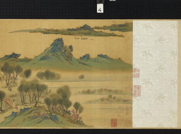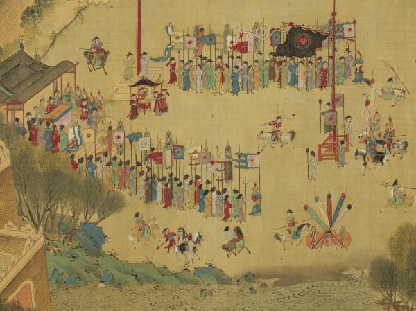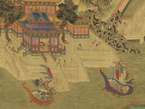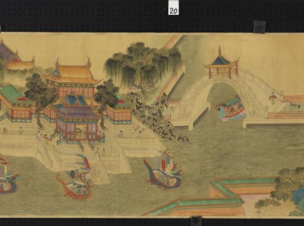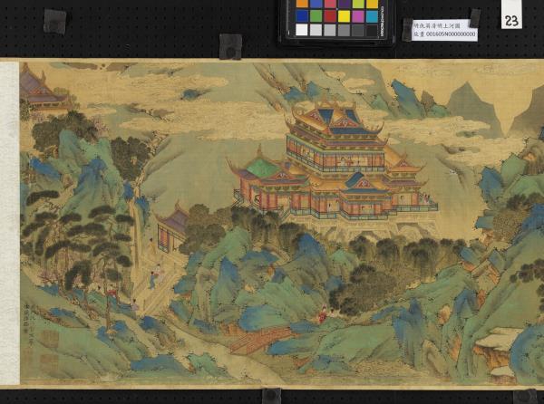 The title here refers to one of the most popular subjects in Chinese painting, attracting great interest since the Ming dynasty. The brushwork and coloring of this work suggest it is a so-called “Suzhou imitation” from the late Ming. The scenery is very interesting, including acrobatics, tightrope walking, and honor guards. The rendering of the boat is also quite inventive. The mountains are done in “blue-and-green,” the palace garden in the rear even more opulent. This work bears a frontispiece composed by the Qing emperor Qianlong while still a prince and transcribed by Liang Shizheng. One of the early works to enter the Qing imperial collection, it had a major influence on the court production of this subject completed in Qianlong’s first year (1736).(20120408)