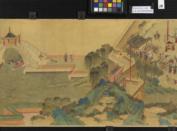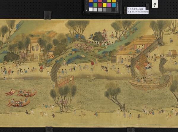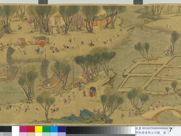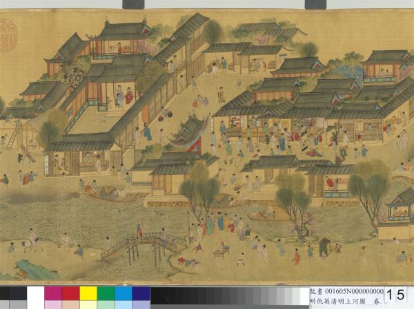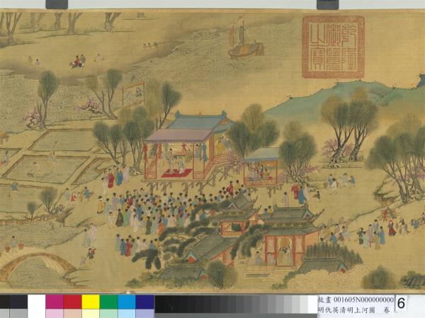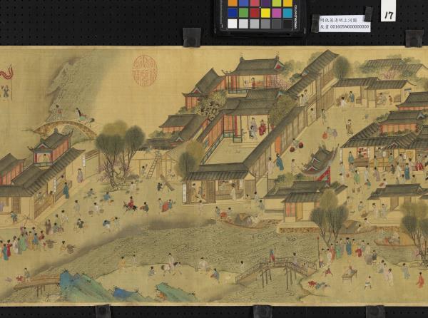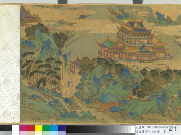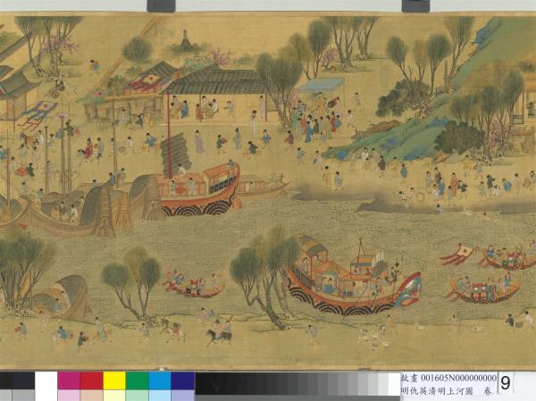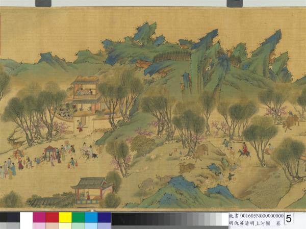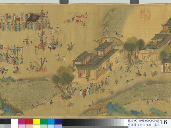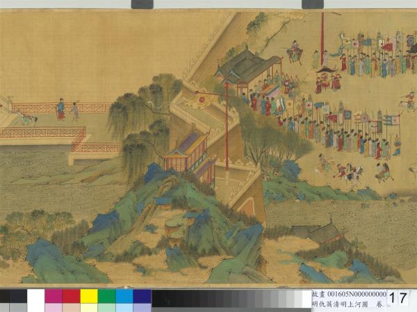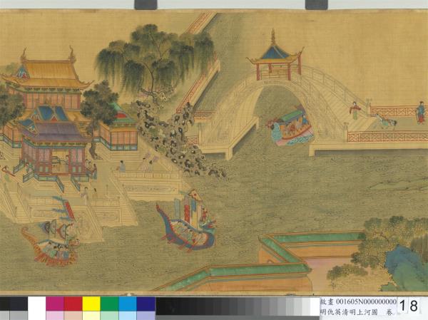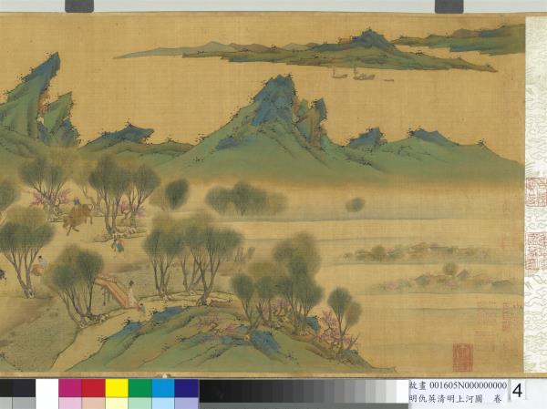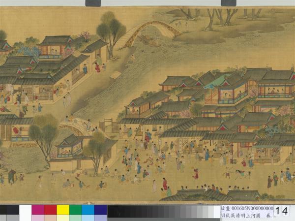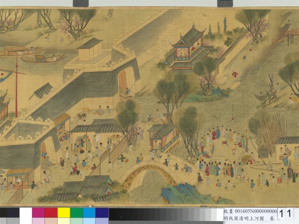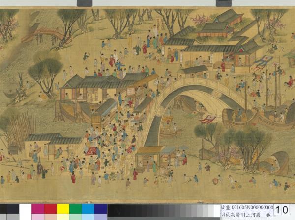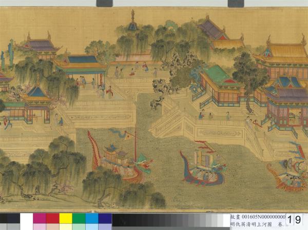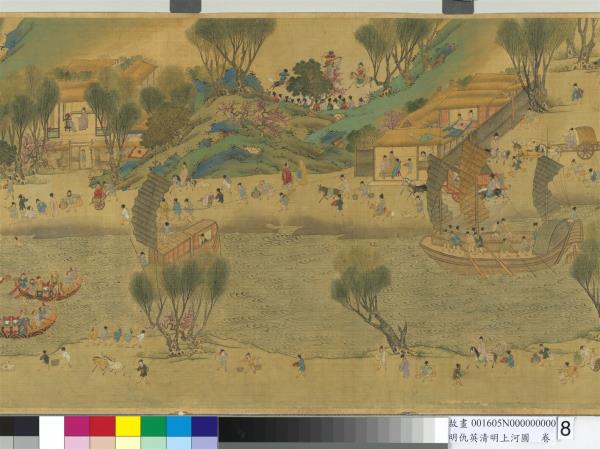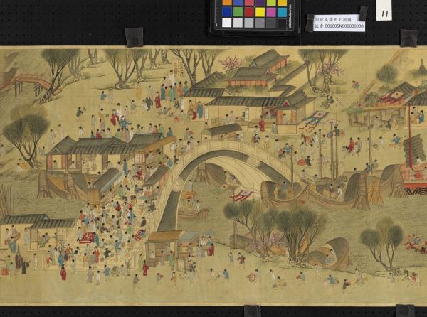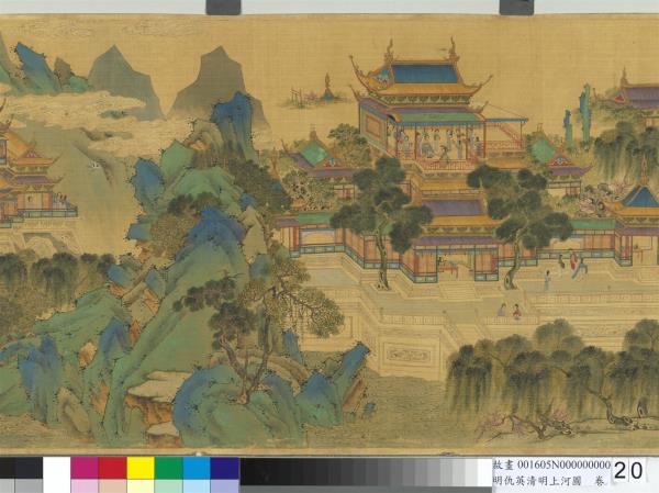 「清明上河圖」是畫史上熱門畫題,明代以來更蔚為風潮。此件舊傳仇英所作,觀其用筆設色應是明代後期,所謂「蘇州片」的作坊作品。畫中景觀多有趣味,如雜技、走索、校閱等,對船隻的描繪也充滿奇想。全卷山石以青碧設色,後段對宮殿園囿的描寫更是華麗。此件引首為乾隆帝為寶親王時期所題,由梁詩正代筆書寫,是早入清宮收藏者,對乾隆元年完成的「清院本清明上河圖」之創繪有相當影響。(20120408)
