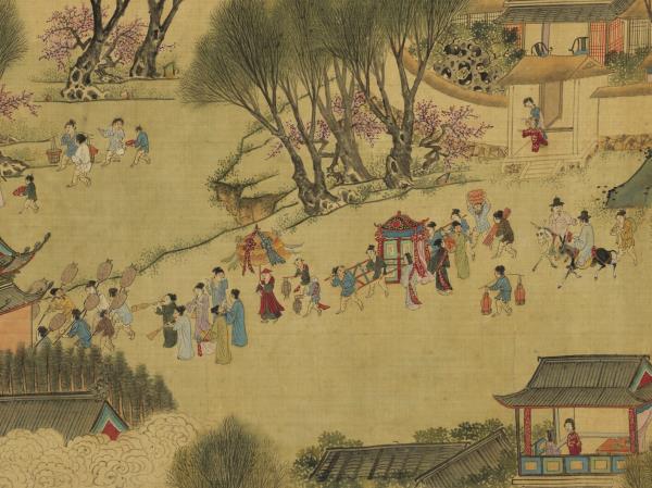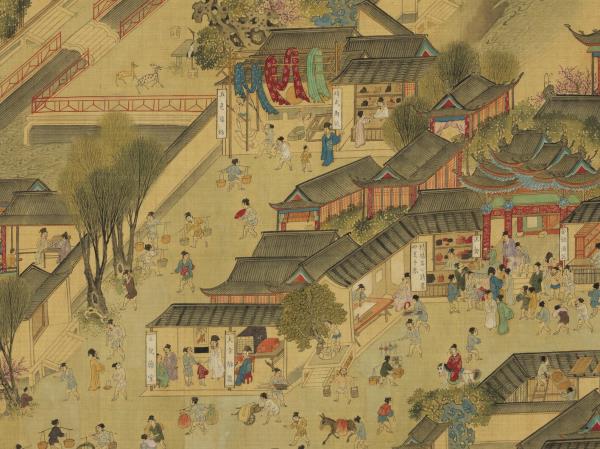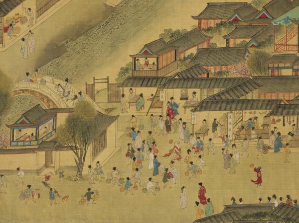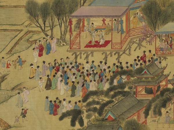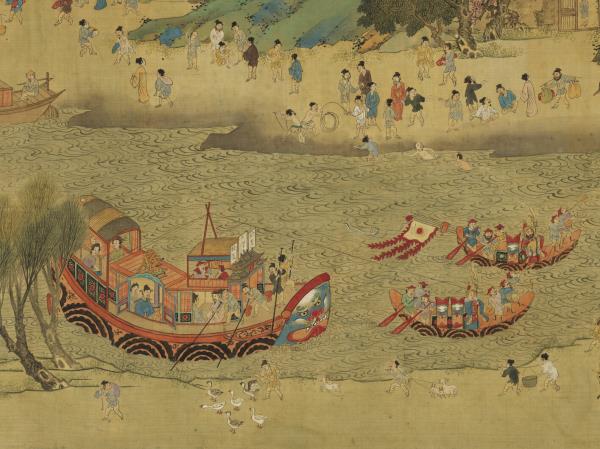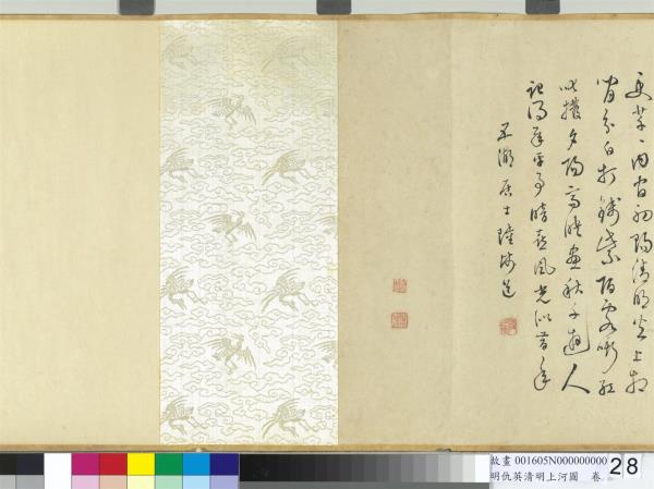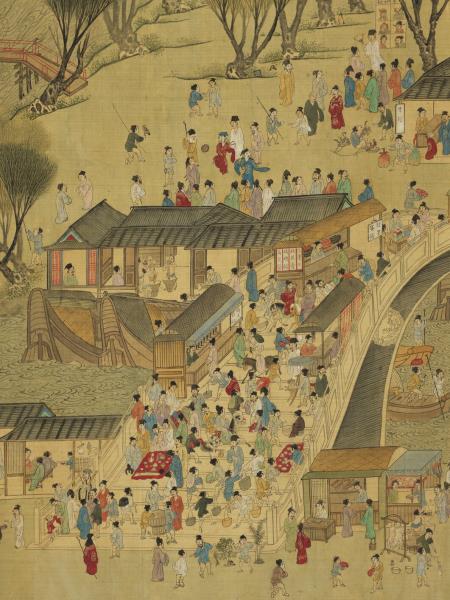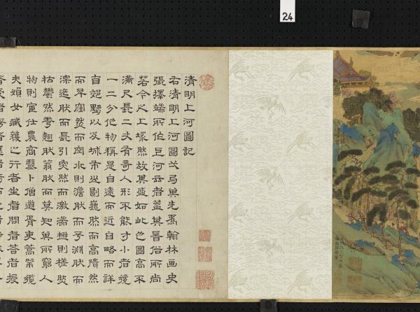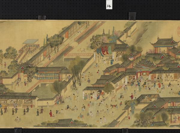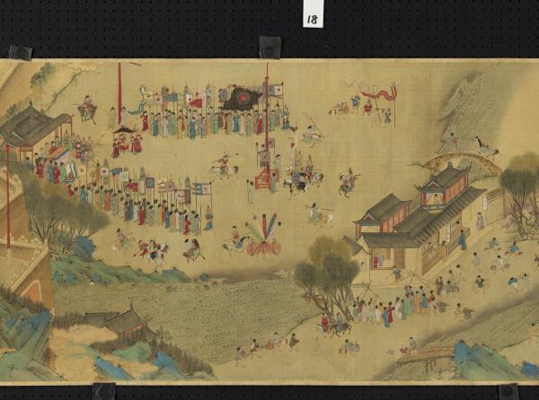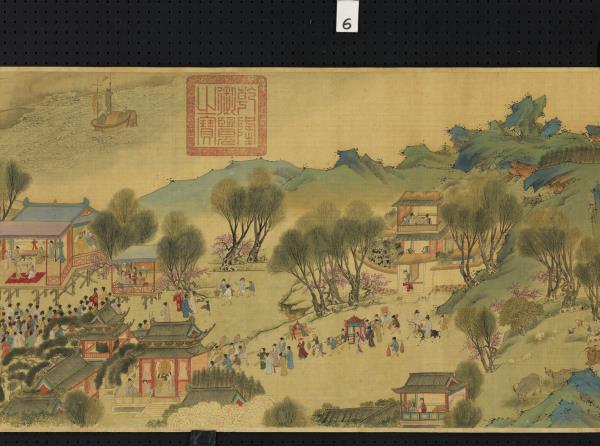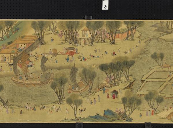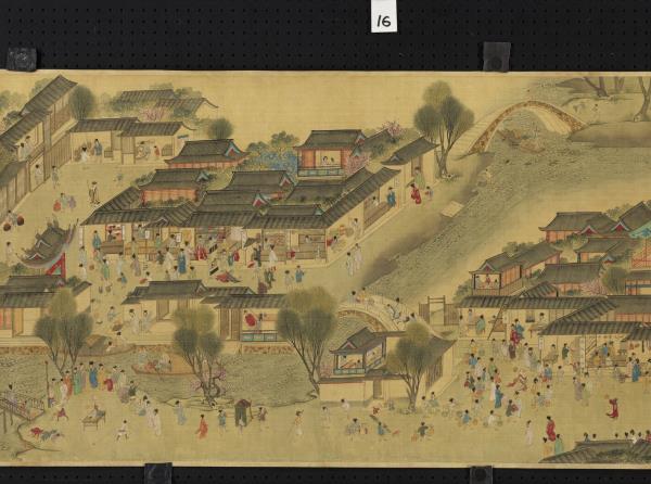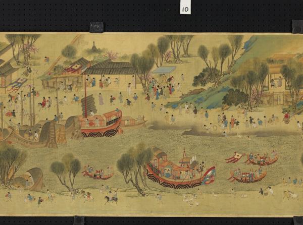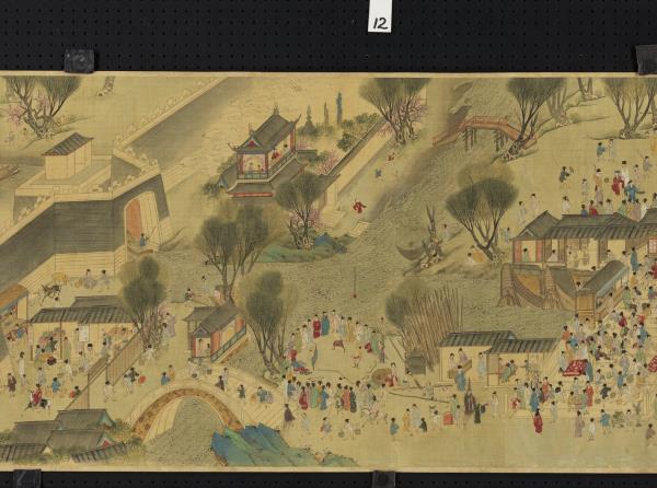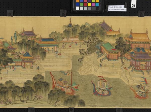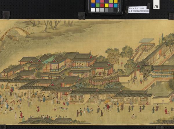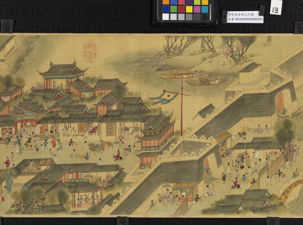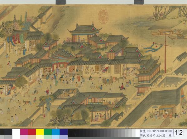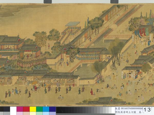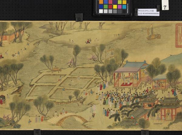 「清明上河圖」是畫史上熱門畫題,明代以來更蔚為風潮。此件舊傳仇英所作,觀其用筆設色應是明代後期,所謂「蘇州片」的作坊作品。畫中景觀多有趣味,如雜技、走索、校閱等,對船隻的描繪也充滿奇想。全卷山石以青碧設色,後段對宮殿園囿的描寫更是華麗。此件引首為乾隆帝為寶親王時期所題,由梁詩正代筆書寫,是早入清宮收藏者,對乾隆元年完成的「清院本清明上河圖」之創繪有相當影響。(20120408)
