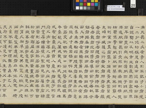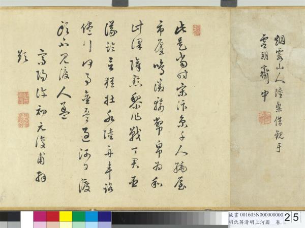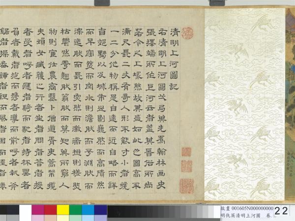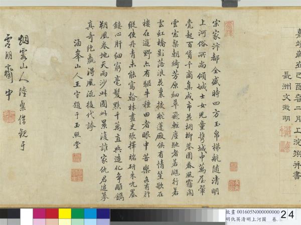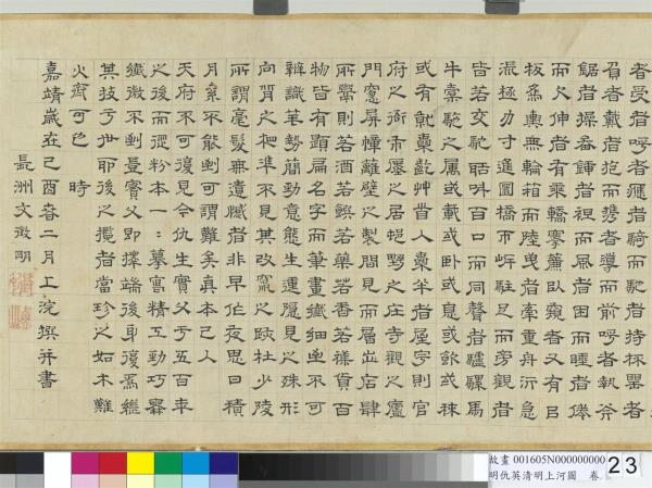 清明上河圖記。右清明上河圖弌□。其先為翰林畫史張擇端所作。上河云者。蓋其習俗所尚。若今之上塚然。故其盛如此也。圖高不滿尺。長二丈有奇。人形不能寸。小者纔一二分。他物稱是。自遠而近。自略而詳。自郊野以及城市。山則巍然而高。隤然而卑。漥然而空。水則澹然而平。淵然而深。迤然而長引。突然而激湍。樹則槎然枯。欝然秀。翹然蓊。然而莫知其所窮。人物則宧仕農商醫卜僧道胥吏篙師纜夫婦女臧獲之。行者。坐者。問者。答者。授者。受者。呼者。應者。騎而馳者。持杯罌者。負而戴者。抱而攜者。導而前呼者。執斧鋸者。操畚鍤者。袒而風者。因而睡者。倦而欠伸者。有乘轎搴簾以窺者。又有以板為輿。無輪箱而陸曳者。牽重舟。沂急流。極力寸進。圜橋匝岸。駐足而旁觀者。若交馳聒叫。百口而同聲者。驢騾馬牛槖駝之屬。或載。或臥。或息。或飲。或秣。或有就囊齕草。首入囊半者。屋宇則官府之衙。市㕓之居。村野之莊。寺觀之廬。門窗屏幛。籬壁之製。間見而層出。店肆所鬻則若酒。若饌。若藥。若香。若雜貨百物。皆有題扁名字。而筆畫纖細制不可辨識。筆勢簡逕意態生動。隱見之殊形向背之□準。不見其改竄之跡。杜少陵所謂毫髮無遺憾者。非早作夜思。日積月累不能到。可謂難矣。真本已入天府不可復見。今仇生實父于五百年之後。而從粉本弌弌摹寫。精工勁巧。無纖微不到。豈實父即擇端後身復為繼其技于世耶。後之攬者當珍之如木難火齊可也。嘉靖歲在己酉(西元一五四九年)春二月上浣撰并書。長洲文徵明。 |