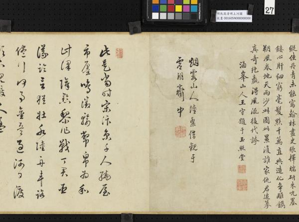 宋家汴都全盛時。四方玉帛梯航隨。清明上河俗所尚。傾城士女兒童攜。城中萬屋翬瓦起。百貨千商集成市。花棚柳巷圍春風。霧閣雲窗粲朝綺。芳原細草飛輕塵。馳者若飆行若雲。虹橋影落浪花裡。捩舵蓬廠俱有情。笙歌在樓在遊野。亦有驅牛種田者。眼中苦樂各有神。縱使丹青未能寫。翰林畫史張擇端。研朱吮墨鏤心肝。細窮毫髮黟千萬。直與造化爭雕鐫。朔風卷地天雨沙。此圖此景復誰家。仇君追摹真奇絕。贏得風流後代誇。涵峰山人王守題于玉照堂。 |