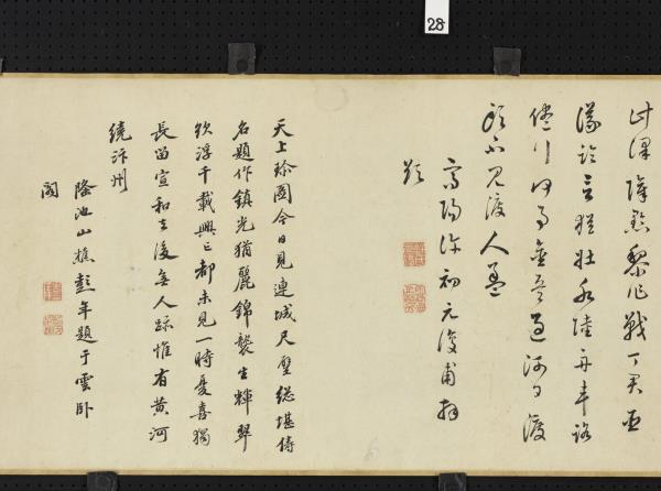 天上珍圖今日見。連城尺璧總堪儔。名題作鎮光猶麗。錦襲生輝翠欲浮。千載興亡都未見。一時憂喜獨長留。宣和去後無人跡。惟有黃河繞汴州。隆池山樵彭年題于雲臥閣。 |