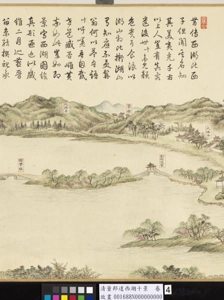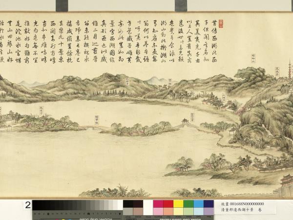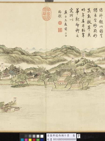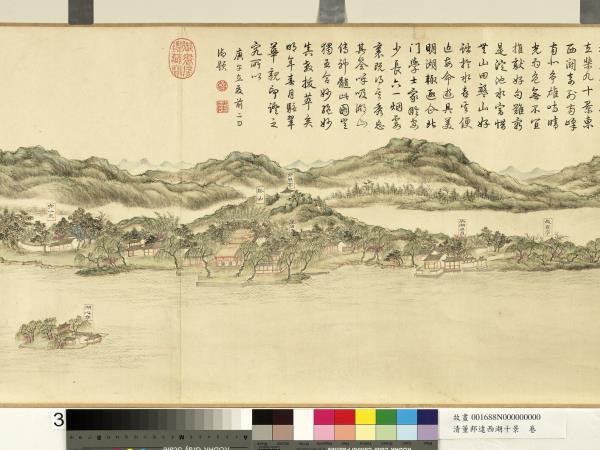 昔傳西湖比西子。但聞其名知其美。夷光千古以上人。豈有真容遺後世。(叶)(小字注)未見顔色貴耳食。浪以湖山相比擬。湖山有知應不受。髯翁何以答吾語。(叶)(小字注)吁嗟吾因感世道。臧否雌黃率如此。豈如即景寫西湖。圖繪真形匪近似。歲維二月巡燕晉。留京結撰親承旨。歸來長卷已搆成。儼置餘杭在棐几。十景東西鬥奇列。兩峰南北爭雄峙。晴光雨色無不宜。推敲好句難窮是。淀池水富惜無山。田盤山好詘於水。喜其便近每命遊。具美明湖輒遐企。北門學士家臨安。少長六一煙霞裏。既得其秀忘其筌。呼吸湖山傳神髓。此圖豈獨五合妙。絕妙真教拔萃矣。明年春月駐翠華。親印證之究所以。庚午(西元一七五0年)立夏前二日。御題。 |