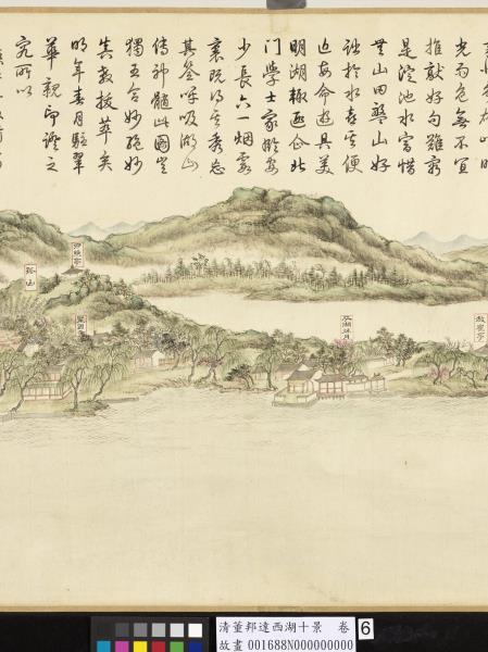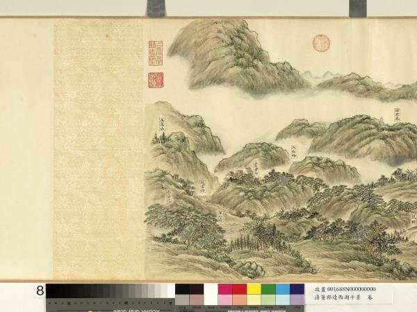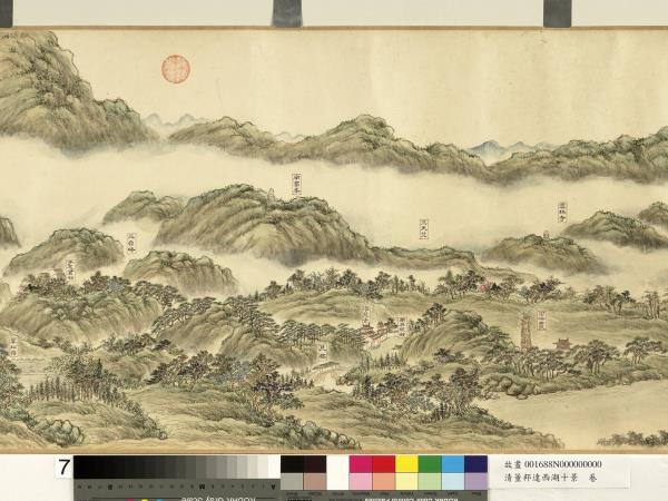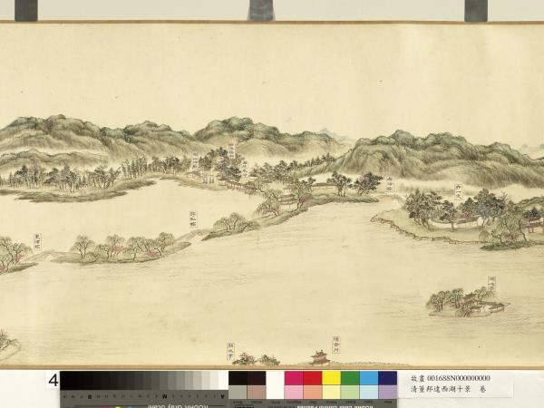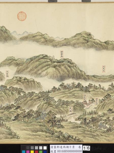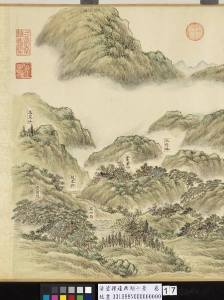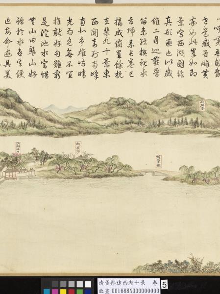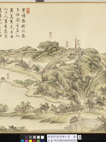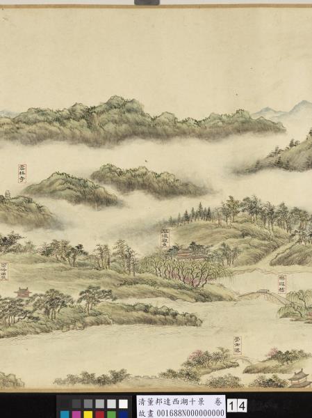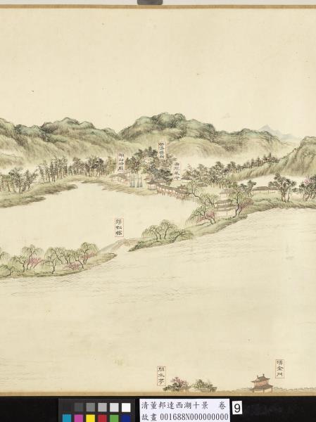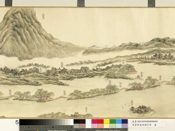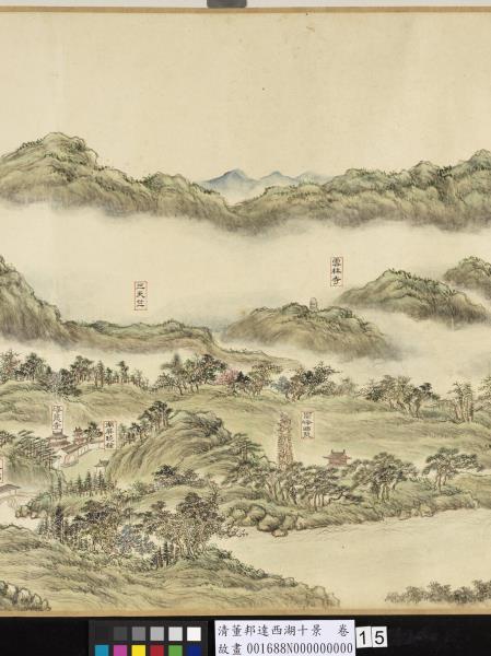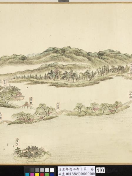 董邦達(一六九九-一七六九),字孚存,浙江富陽人。雍正十一年(一七三三)進士,曾參與編修石渠寶笈等書,官至禮部尚書。畫山水宗法董其昌,以清麗勝。本幅以長卷形式描繪鳥瞰所見西湖諸景。西湖十景之名源自南宋,清康熙南巡時敕令重修,並題名立碑建亭,再現盛觀。畫中筆致鬆秀細潤,隨處標示各景點的名稱,相較於院藏同畫家所繪以西湖個別景觀為題的立軸,更接近全景地圖的性質。