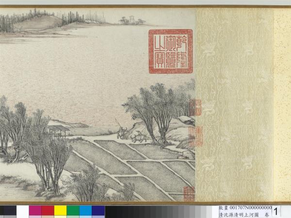 Shen Yuan's version of "Up the River During Qingming" remarkably resembles the famed cooperative Qing academy scroll in terms of composition, except he has primarily used monochrome ink, with only umber for outlines. Through this, he has created a refreshing effect of elegance and grace. His brushwork is highly practiced, and the bridges and buildings depicted in the ruled-line method as well as the figures are all executed in great detail. This represents a fine example of Qing court painting.