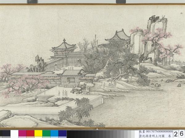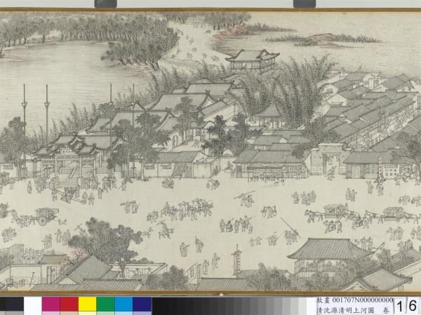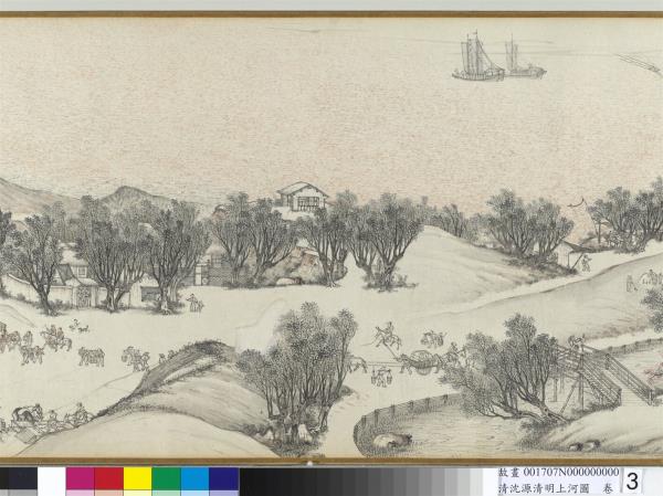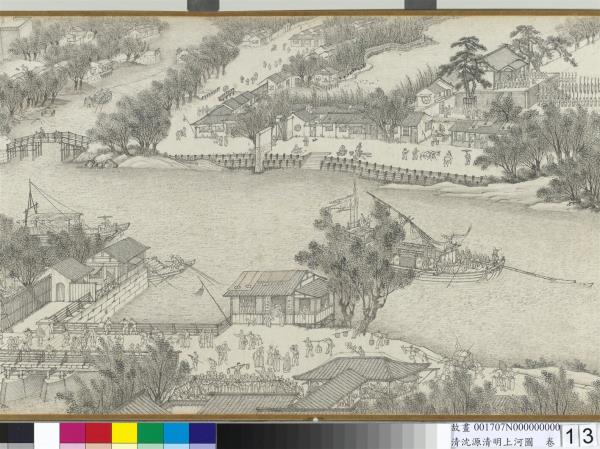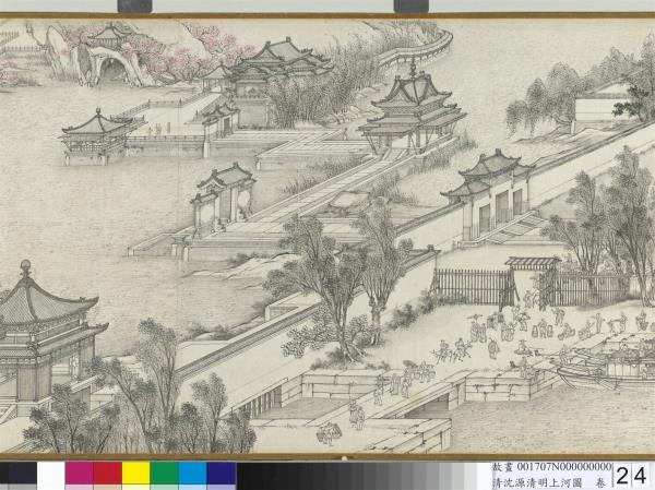 沈源の『清明上河図』の構図と場面の配置は、『清 院本清明上河図』とほぼ同じであり、細部における增減の違いだけが見られる。例えば前段の墓參の場面や中段の金蘭居の位置などは『清 院本清明上河図』とほとんど変わらないが、屋號や建築の構造、畫法が異なるほか、狀元邸宅の庭園の景観なども若干異なっている。さらに豪邸の庭園や楼閣の構造にも相違があり、西洋建築の特徵も沈源の作品には見られない。また、後段の大木橋の漁網の前には、犬が積んだ食べ物をひっくり返す場面が描かれている。本作は水墨を中心とし、紅褐色で軽く鉤染(輪郭を描いて彩りをする)を加えただけで、爽やかで淡雅な趣がある。用筆は熟練しており、界畫による橋梁、家屋、人物の描写はいずれも精緻であり、畫院の佳作である。(20100408)