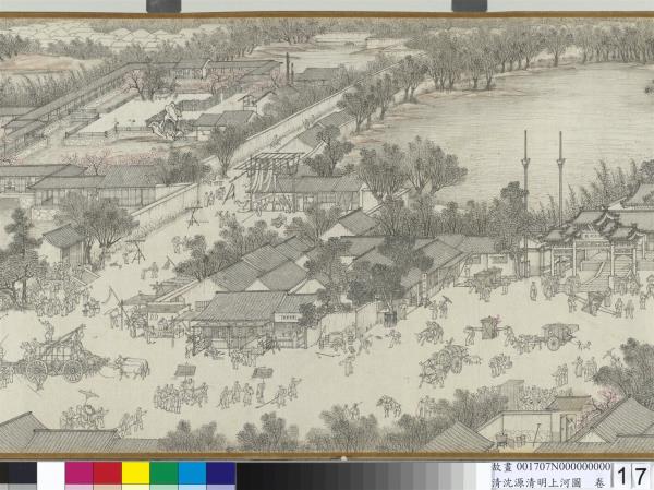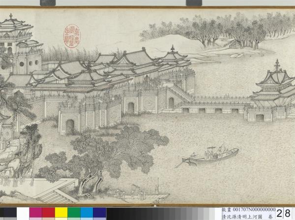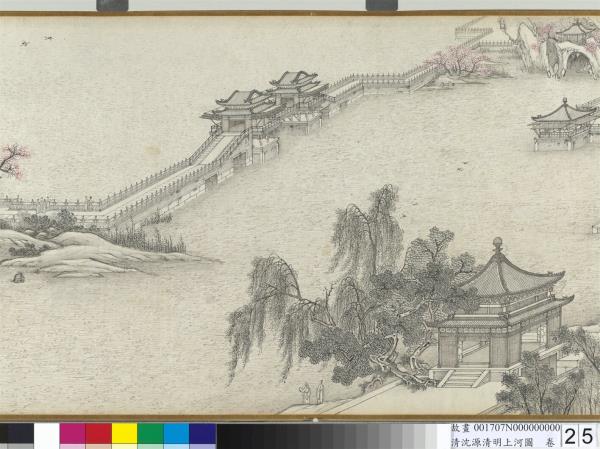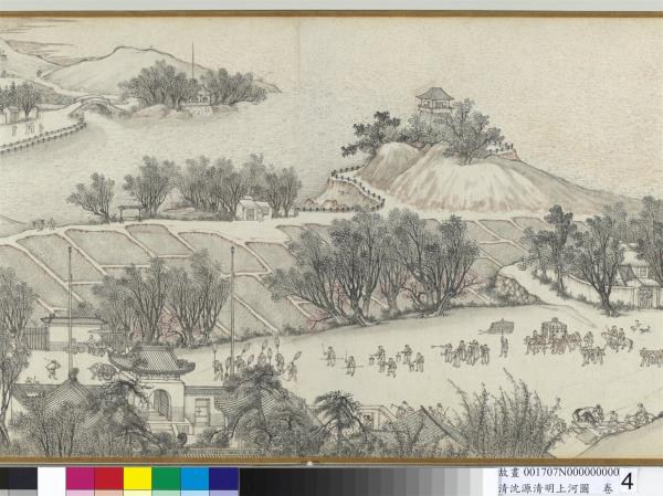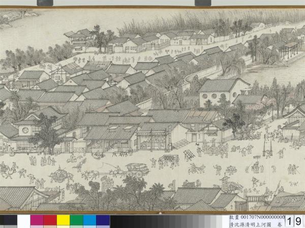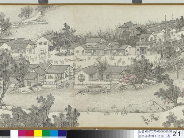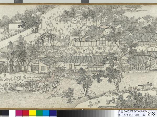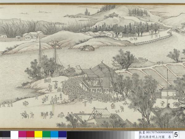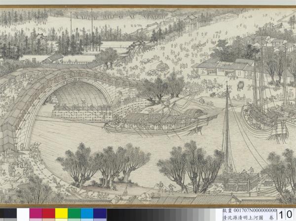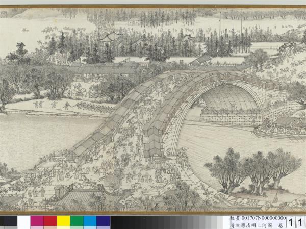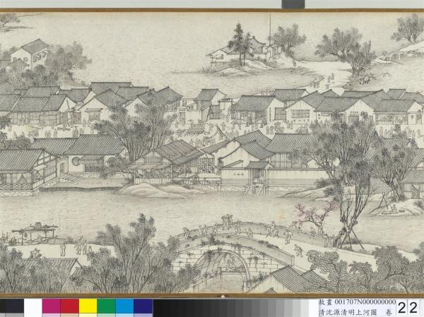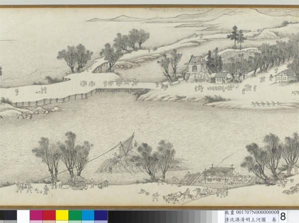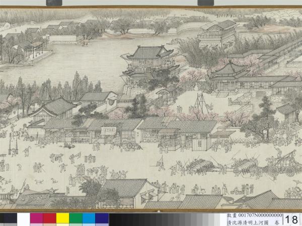 沈源,乾隆時(西元一七三六-一七九五年)供奉內廷,善畫佛像,並工山水界畫。 沈源「清明上河圖」的構圖,與清院本「清明上河圖」幾乎相同,但以水墨為主,在用色方面,更只用赭色稍加鉤染,自有一番清新雅淡的韻味。用筆熟練,界畫橋樑、屋宇、人物皆極為精細工整,亦清畫院中之佳作。(20100408)
