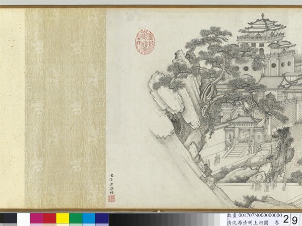 Shen Yuan’s version of “Up the River During Qingming” remarkably resembles the famed cooperative Qing academy scroll in terms of composition, except he has primarily used monochrome ink, with only umber for outlines. Through this, he has created a refreshing effect of elegance and grace. His brushwork is highly practiced, and the bridges and buildings depicted in the ruled-line method as well as the figures are all executed in great detail. This represents a fine example of Qing court painting.(20100408)