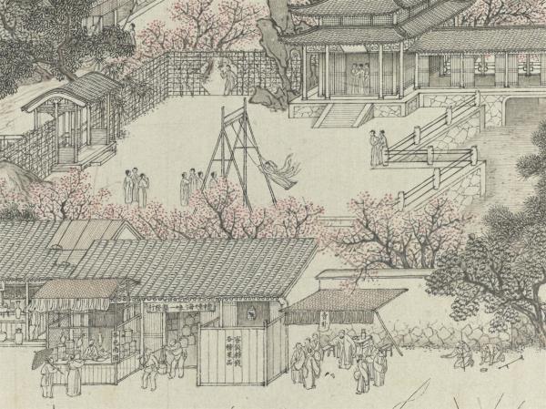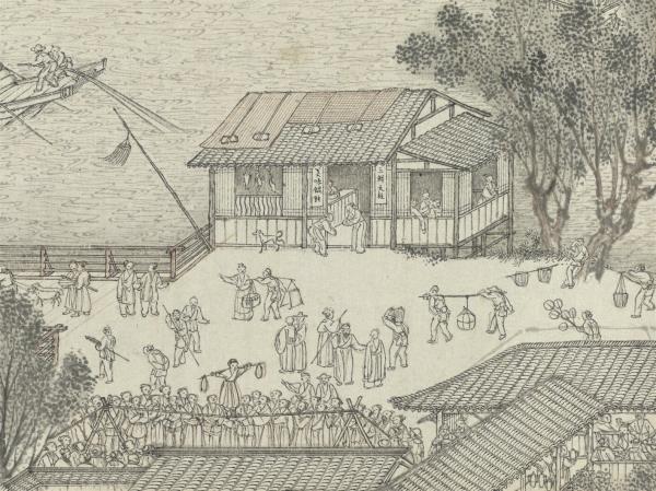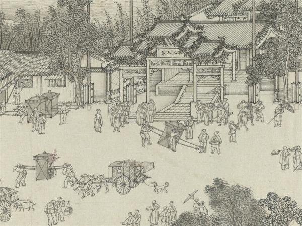 The composition and arrangement of scenes in Shen Yuan's "Up the River During Qingming" are almost identical to the Qing court cooperative version. Only a few minor changes were made, such as the scene of crying during tomb sweeping at the front of the scroll. The location of Gold Orchid Tavern is also similar, but the tavern name, structure, and method of depiction vary slightly. Small differences can likewise be found in the garden arrangement of the official's mansion. Other changes include the homes of the wealthy, pavilion structures, and the lack of Western-style architecture. There is also the arrangement of a humorous scene of a dog overturning a food pole before the netting fish activity and after the large wooden bridge. This work was done mostly in monochrome ink with only slight washes of umber used for coloring, giving it a light and refreshing quality. Shen Yuan's brushwork is skillful and the rendition of the ruled-line bridges, buildings, and figures all done with exceptional precision, making this another gem related to the Qing court academy of painting. (20100408)