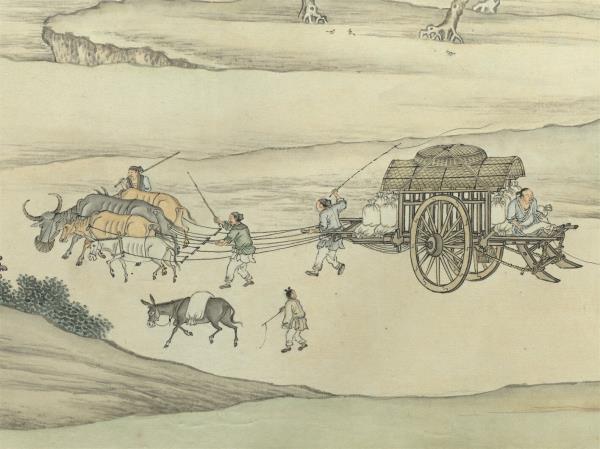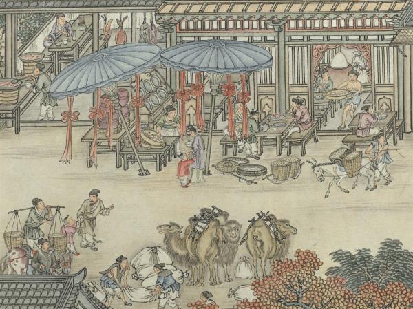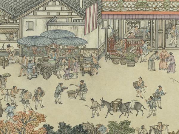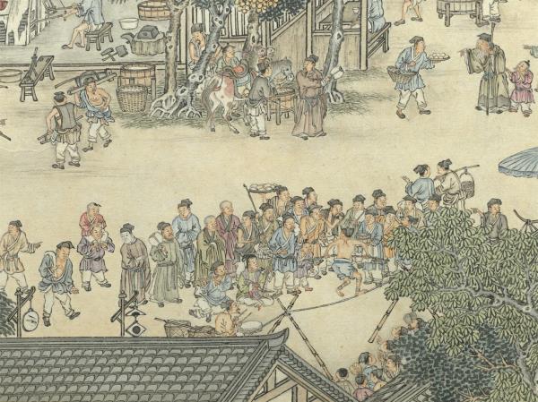 This handscroll documents the activities of urban life in traditional China. Starting from the right, a peaceful rural scene in the suburbs comes into view. Crossing the moat, we enter the city of Jinling (the old name for Nanjing), where many people and vehicles ply streets with various shops and stalls with different things. Men and women, both young and old, crisscross the bustling city. Done in bright and beautiful colors, the figures’ expressions and actions are lively, and details are finely done, too. The signature gives a date equivalent to 1791. This work (along with the Museum’s version of “Up the River on the Qingming Festival”) is representative of a long handscroll genre painting.(20100101)