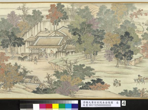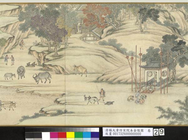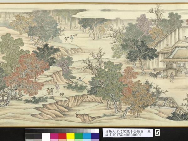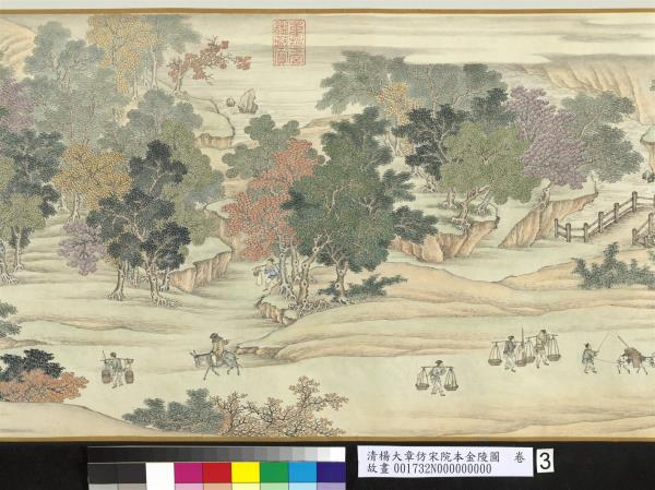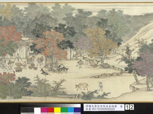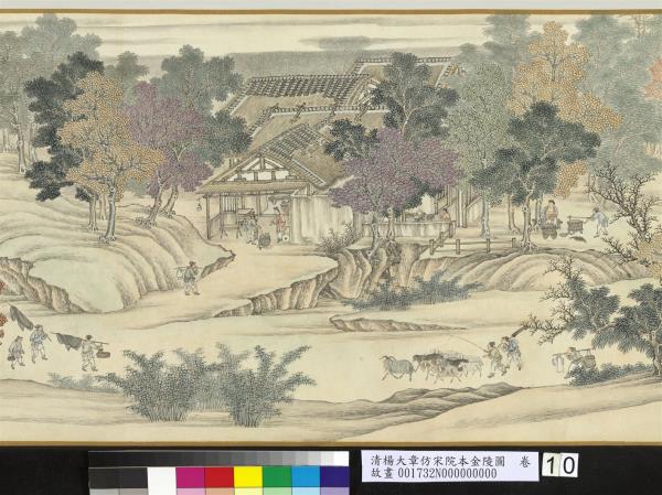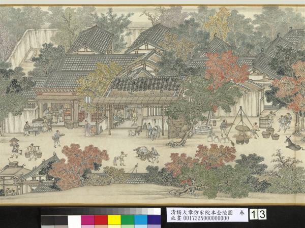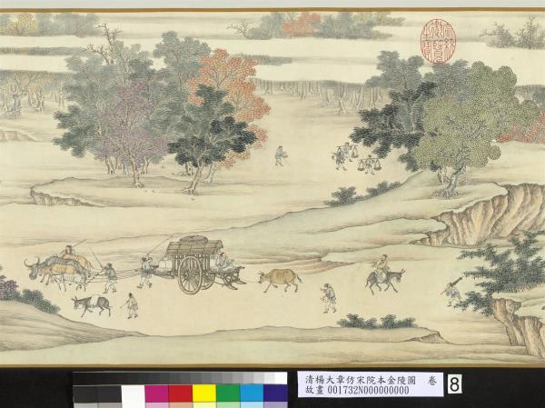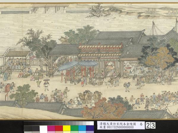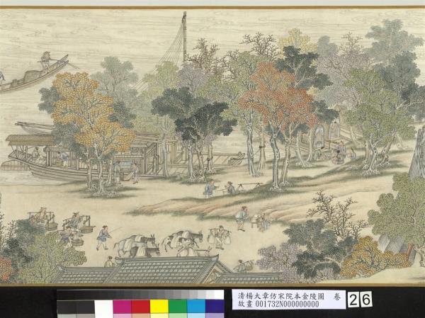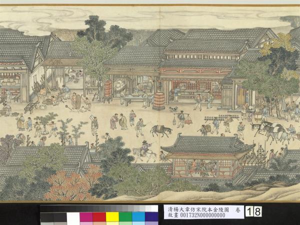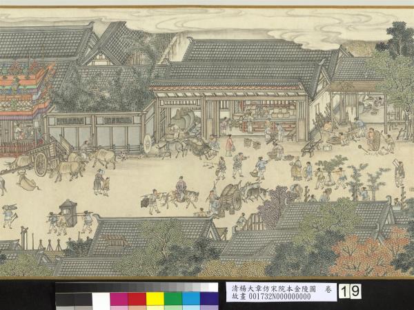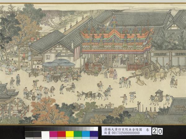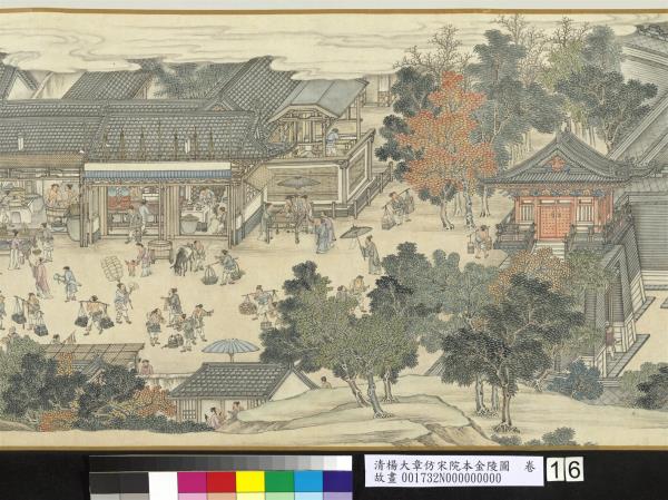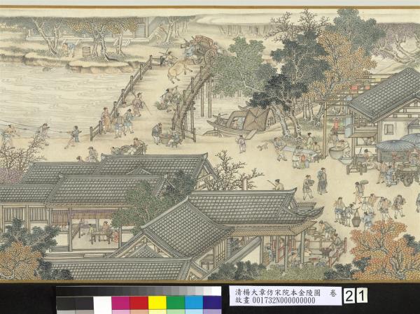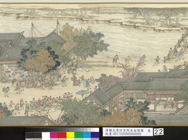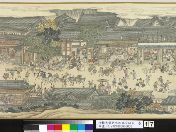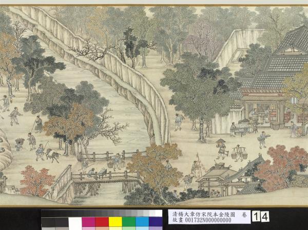 楊大章,乾隆時供奉內廷,工人物、花鳥畫。本卷記錄古代城市生活的形形色色,自右開始映入眼簾是恬靜的郊區農村,過護城河後進入金陵城,城裡人車雜沓,各類店鋪林立,販夫走卒、男女老少穿梭於熱鬧喧囂的市井中,全卷用色鮮明清亮,人物表情姿態生動,細節講究,根據幅上作者款識,畫成於乾隆五十六年(西元一七九一年)。與院藏〈清院本清明上河圖〉皆為長卷式寫實風俗畫的代表。(20100101)