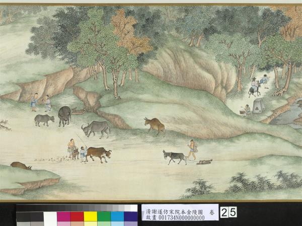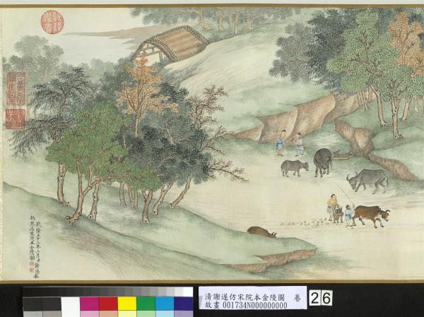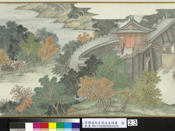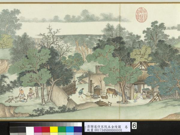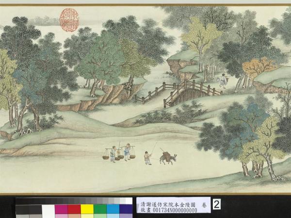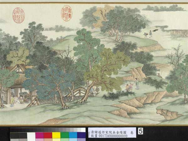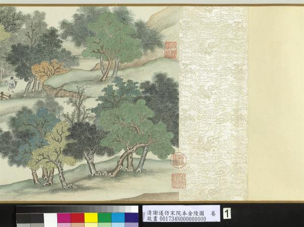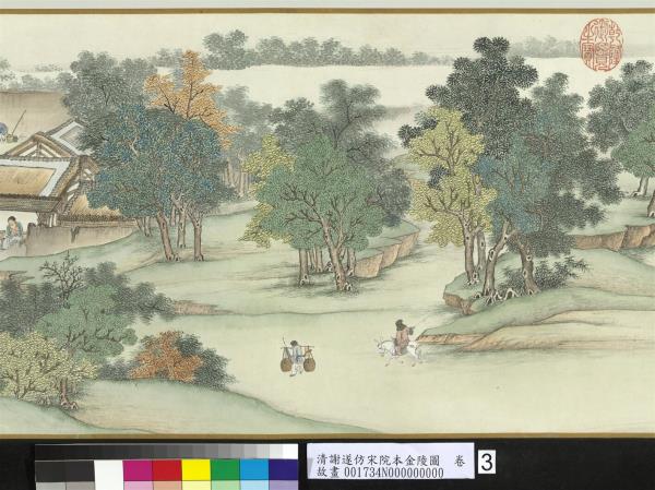 乾隆五十二年(西元一七八七年)二月。臣謝遂奉敕恭仿宋院本金陵圖。 |