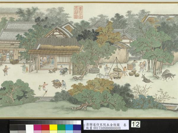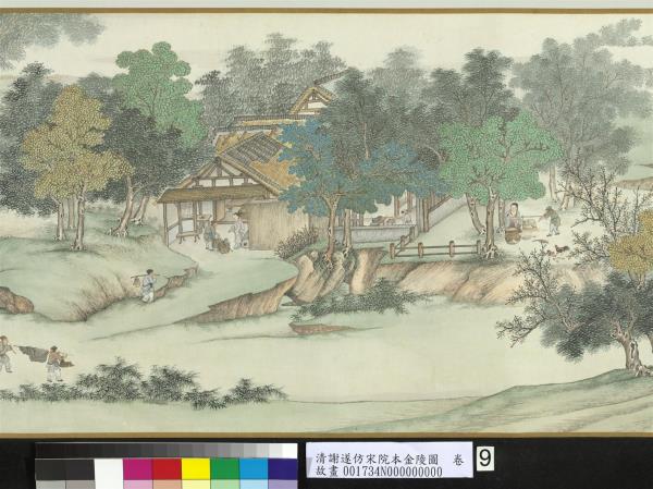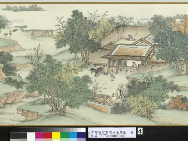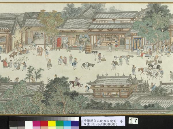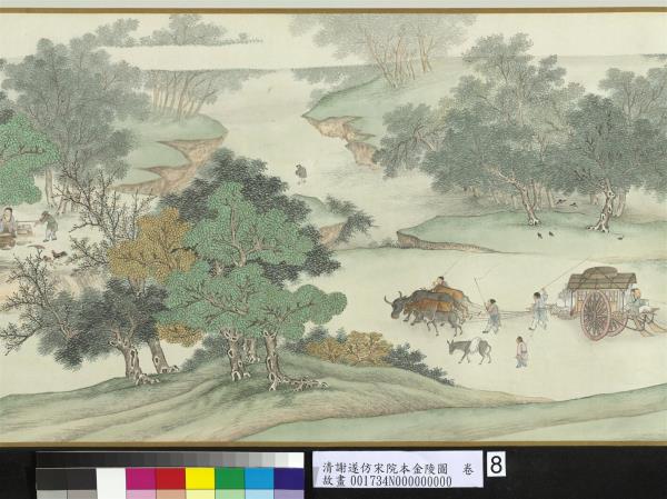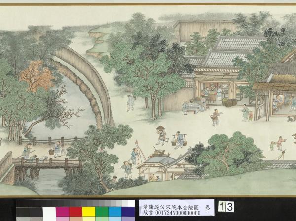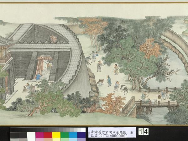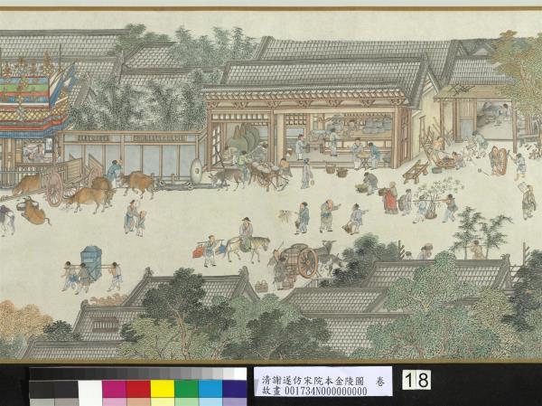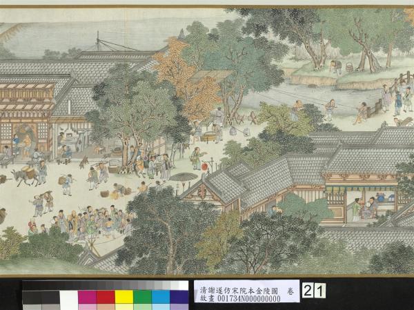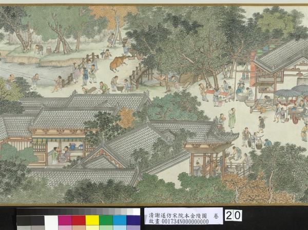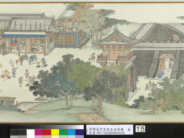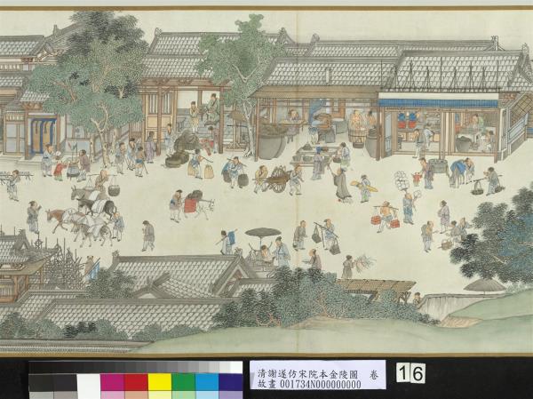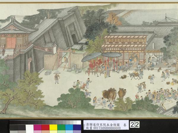 本卷畫金陵城的城市村廛,店鋪街景,市井人物,細節繁多,熱鬧非凡。全圖用筆精謹,人物神情生動。根據幅上作者款識,畫成於乾隆五十二年(西元一七八七年)。本院收藏中另有一卷楊大章仿宋院本金陵圖,並列比較,發現二卷構圖佈局均十分類似,唯此卷設色鮮麗,在細節人物方面略有減省。