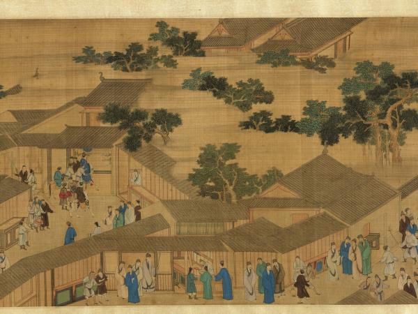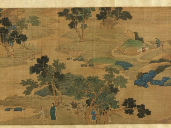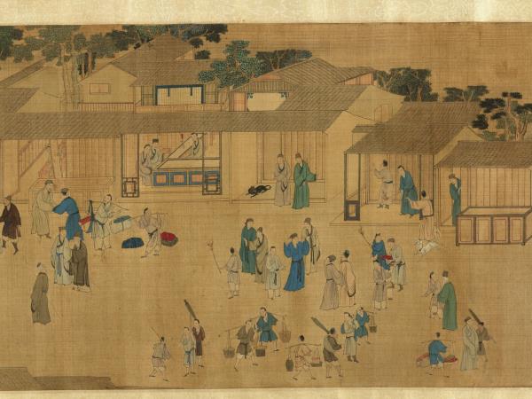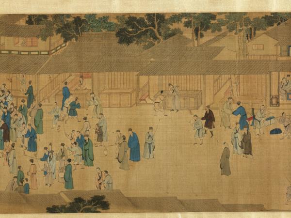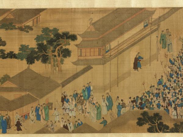 以考試選拔官吏的科舉制度始於隋代(605),至明清兩朝而大備。畫卷呈現清晨時分,眾人舉火查榜的景況。懸榜處萬頭鑽動,畫中表現參加考試者,昂首專注查榜的神情。落榜者被攙扶離去的身影,細膩地傳達時人對入仕途徑的營求與應試者渴慕功名的心態。