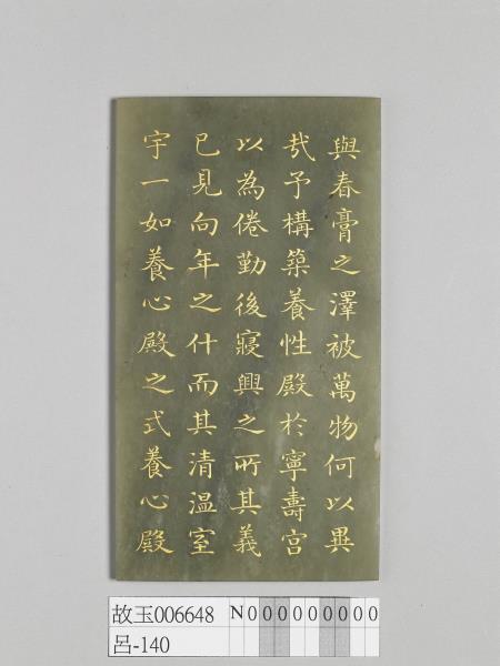 玉版,兩面為填金楷字,內容均為清高宗所作〈墨雲室記〉的部份,字則由胡季堂(1729-1800)書寫。同式玉版共有四片(故玉6646-6649),組成完整的〈墨雲室記〉一文。所謂〈墨雲室記〉,是清高宗因喜愛畢沅(1730-1797)所進之李廷珪墨,以之命名養性殿西暖閣為「墨雲室」時,記述此事的文章。此玉版與同樣書有〈墨雲室記〉的冊頁(故書1122)同儲於長方木盒(故玉6646N1)中。