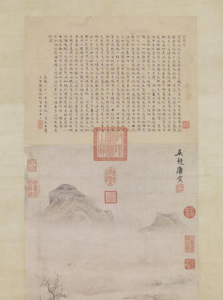 琵琶行。潯陽江頭夜送客。楓葉荻花秋瑟瑟。主人下馬客在船。舉酒欲飲無管絃。醉不成歡慘將別。別時茫茫江浸月。忽聞水上琵琶聲。主人忘歸客不發。尋聲暗問彈者誰。琵琶聲停欲語遲。移船相近邀相見。添酒回燈重開宴。千呼萬喚始出來。猶抱琵琶半遮面。轉軸撥弦三兩聲。未成曲調先有情。弦弦掩抑聲聲思。似訴平生不得志。低眉信手續續彈。說盡心中無限事。輕攏慢撚撥復挑。初為霓裳後六么。大絃嘈嘈如急雨。小絃切切如私語。嘈嘈切切錯雜彈。大珠小珠落玉盤。間關鶯語花底滑。幽咽泉流水下灘。冰泉冷澀絃凝絕。凝絕不通聲暫歇。別有幽愁暗恨生。此時無聲勝有聲。銀瓶乍破水漿迸。鐵騎突出刀鎗鳴。曲終抽撥當心畫。四弦一聲如裂帛。東船西舫悄無言。惟見江心秋月白。沉吟收撥插弦中。整頓衣裳起斂容。自言本是京城女。家在蝦蟇林下住。十三學得琵琶成。名屬教坊第一部。曲罷常教善才服。妝成每被秋娘妒。五陵年少爭纏頭。一曲紅綃不知數。鈿頭銀篦擊節碎。血色羅裙翻酒污。今年歡笑復明年。秋月春花等閑度。弟走從軍阿姨死。暮去朝來顏色故。門前冷落車馬稀。老大嫁作商人婦。商人重利輕別離。前月浮梁買茶去。去來江口守空船。遶船明月江水寒。夜深忽夢少年事。夢啼妝淚紅闌干。我聞琵琶已嘆息。又聞此語重唧唧。同是天涯流淪落人。相逢何必曾相識。我從去年辭帝京。謫居臥病潯陽城。潯陽地僻無音樂。終歲不聞絲竹聲。住近湓城江地低濕。黃蘆苦竹遶宅生。其間旦暮聞何物。杜鵑啼血猿哀鳴。豈無山歌與村笛。嘔啞啁哳難為聽。今夜聞君琵琶語。如聽仙樂耳暫明。莫辭更坐彈一曲。為君翻作琵琶行。感我此言良久立。却坐促弦弦轉急。淒淒不似向前聲。滿坐聞之皆掩泣。就中泣下誰最多。江州司馬青衫溼。嘉靖二十一年壬寅(西元一五四二年)秋八月五日。書于玉蘭堂。徵明時年七十三。 |