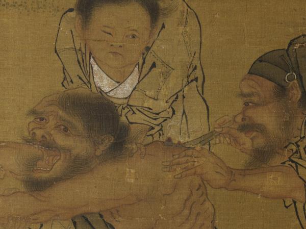 此幅畫行腳醫生治病情形。病人齜牙咧嘴痛苦難耐,醫生正設法以炙艾法將其膿引出。在畫家巧妙的安排下,每個人物皆有出色的演出。