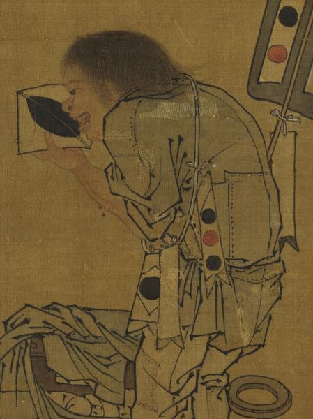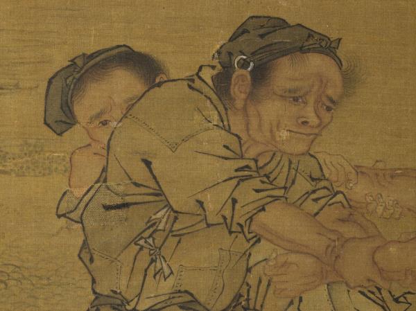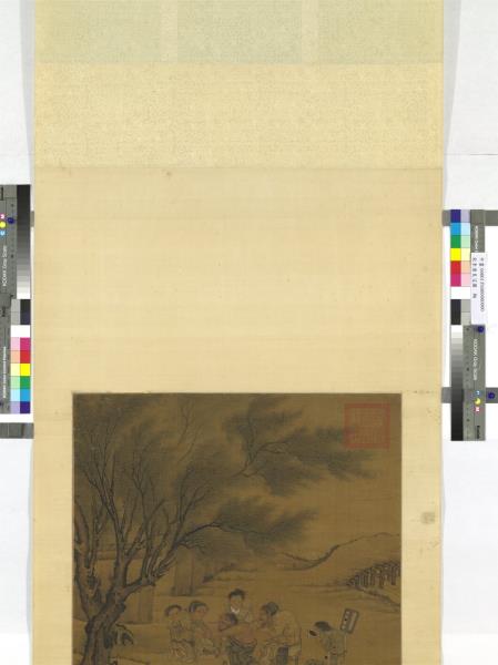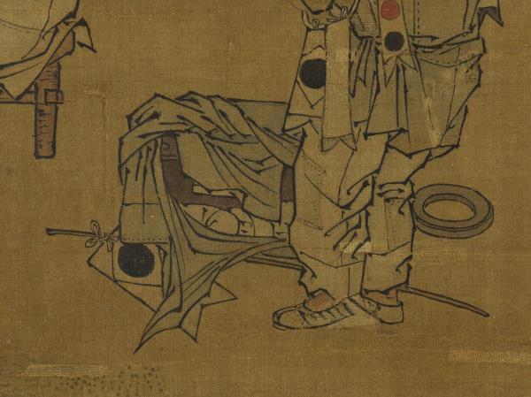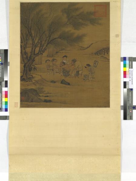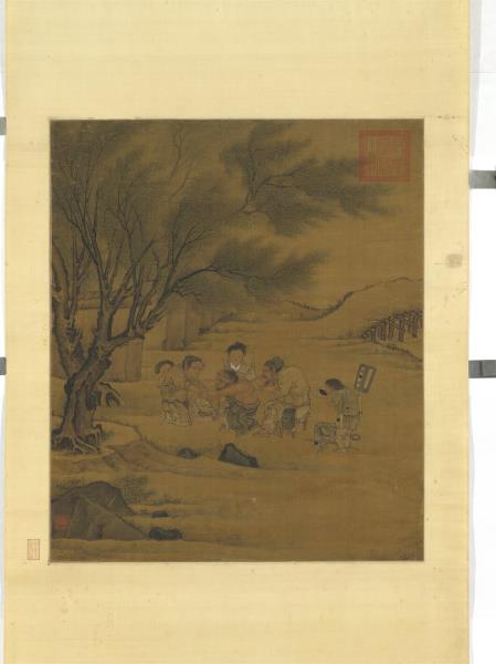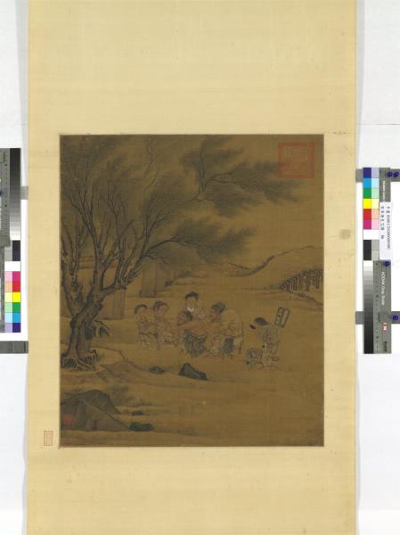 The drapery lines of the figures in this work were rendered using a centered brush to make fine yet powerful strokes in a technique known as “nail-head, rat-tail” lines, which aptly describe the coarse clothing of common folk in the countryside. The exaggerated and almost comical expressions and gestures of the figures present a facet of rural life to our eyes, the brushwork and coloring here following in the style of naturalism practiced in the Song dynasty. This is a masterpiece of realistic genre painting from the Painting Academy of the Southern Song court.(20101015)
