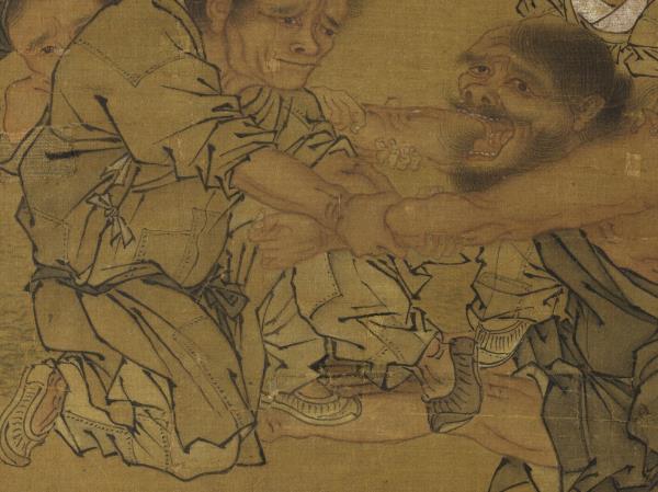 This painting shows an itinerant doctor in the process of treating a patient, who screams in pain as the doctor applies the traditional method of moxibustion to burn wormwood and draw out pus. Through the clever arrangement of the artist, every person here plays an outstanding role.