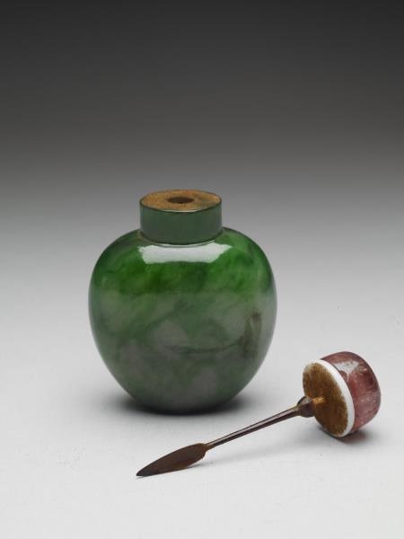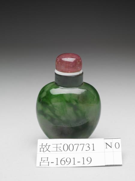 | 說明 | 翠玉鼻煙壺,晶體顆粒緻密,拋光精細,質地潤澤瑩亮,白底混翠綠色。短頸弧肩,圓腹,腹下部漸歛,通體光素無紋。帶粉色碧璽蓋及牙匙,與故玉7730、7732、7733同收一木盒中。 |