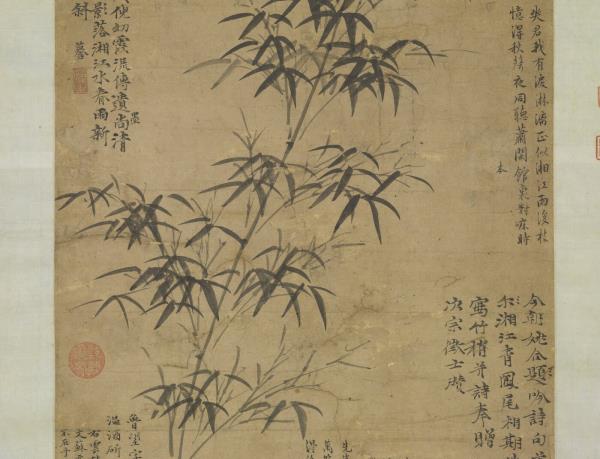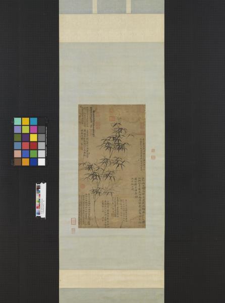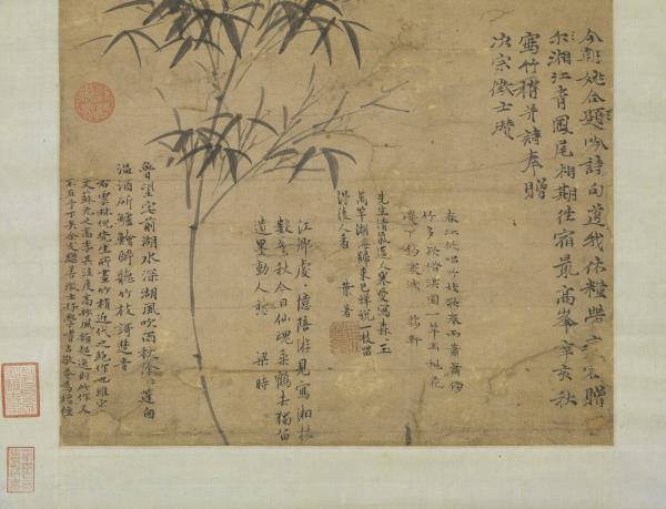 本幅寫新篁側出,竹葉俱呈弧狀,不寫雨而雨意盎然。幅左題句言及:「哭君我有淚淋漓,正似湘江雨後枝。」元代文人畫思想鼎盛,畫家多假物象暗寄故國之思,復因逸筆簡率,時人乃得於畫幅空處題贊抒懷,益增作品畫外之趣。此幀墨竹題語多達十則,即為文人畫的具體印證。