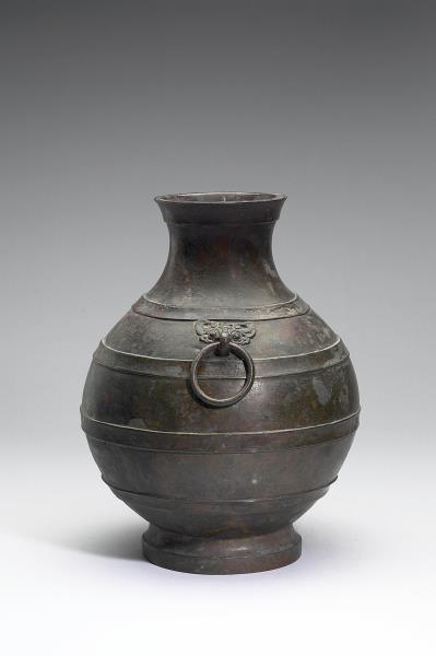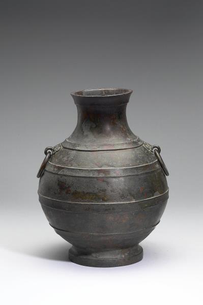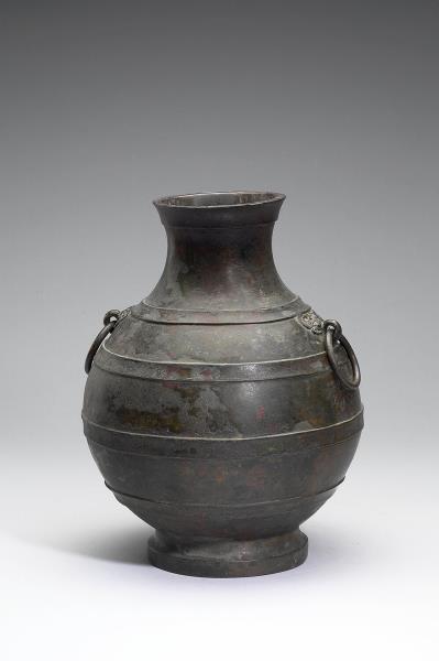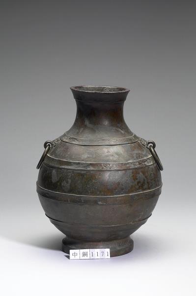 圓壺,盤口,短頸,斜肩,圓腹,階狀圈足,器頸兩側有鋪首銜環。肩部與腹部飾凸棱四道。