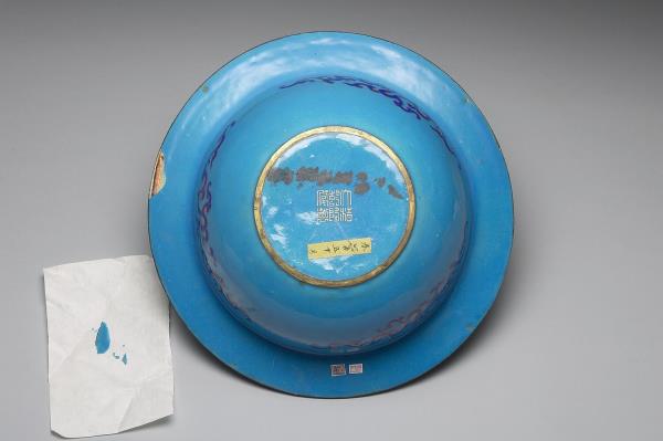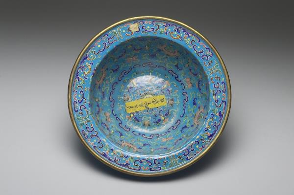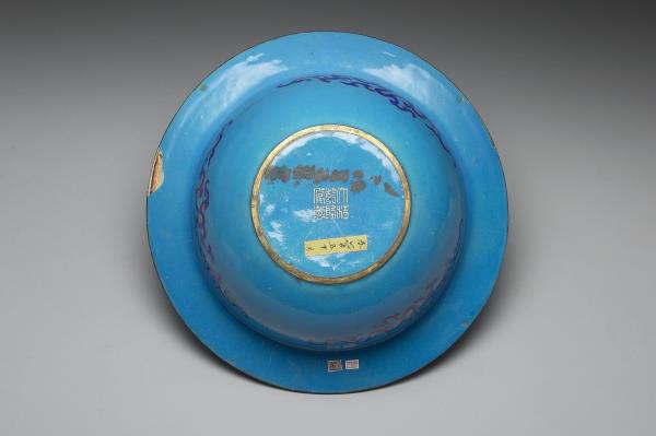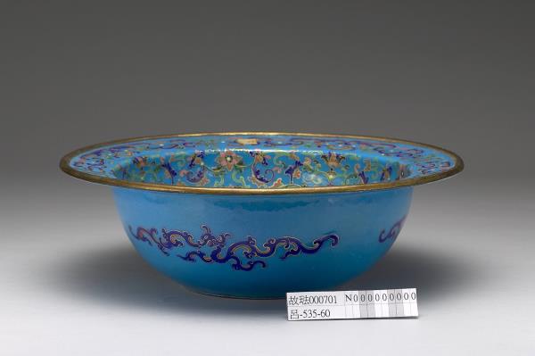 銅胎,掐絲琺瑯。侈口,寬折沿,深弧壁,平底。全器施藍色釉,盆心飾一正面蓮花,內壁飾番蓮、雲紋數道,折沿作雲紋與卷葉紋,器外有三組螭紋,釉色明亮。器底有掐絲篆款「大清乾隆年製」。