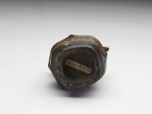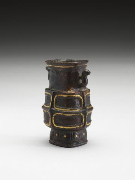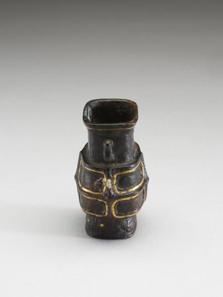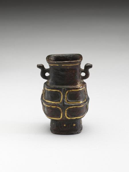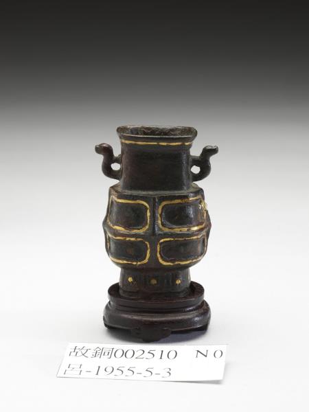 方壺,長方形口,平肩,微鼓腹,方足。頸作二簡化獸首環耳。局部錯金。附木座。