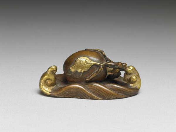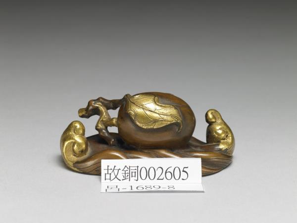 全器以銅製成,瓜身呈橢圓形,圓潤飽滿,頂端接蒂,葉片披散於瓜身周圍。座呈長條形並帶有水波,兩端翹起,側邊表面陰刻曲線紋飾。瓜果的葉片與座兩端塗金彩。