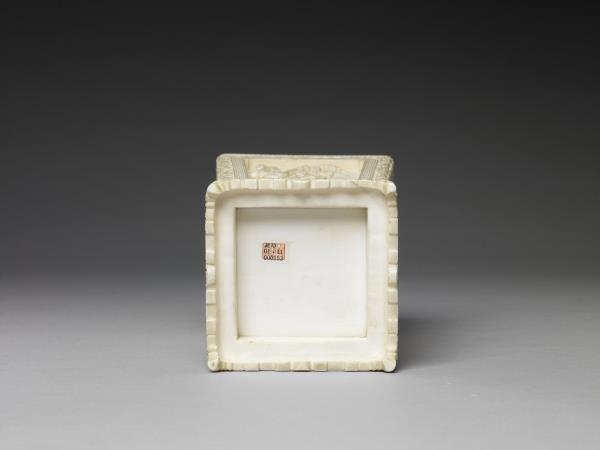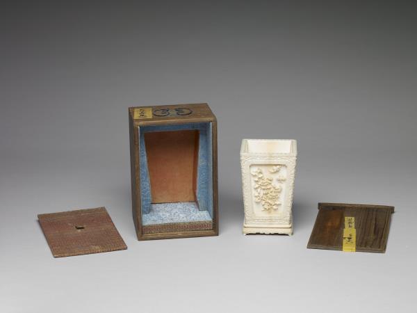 | 說明 | 四方形,侈口,以象牙分別雕製四片筒壁及筒座後組合而成,以深淺浮雕及陰線刻製作圖紋,口緣頂端刻回紋邊飾,四周刻連珠紋,四壁中央有四邊形開光,內部分別以高浮雕刻菊花、蝴蝶紋,意寓「福壽」;蓮花、稻穗紋,意寓「連歲」;芙蓉意寓福氣;梅花、天竹、水仙有「仙祝吉祥」之意。開光圍以回紋邊框,外側飾蝙蝠、蓮花、海棠,座飾蓮瓣紋及如意雲紋,有四如意雲足。 |