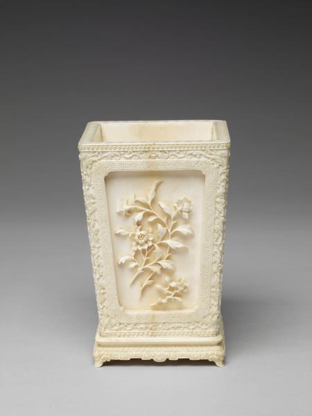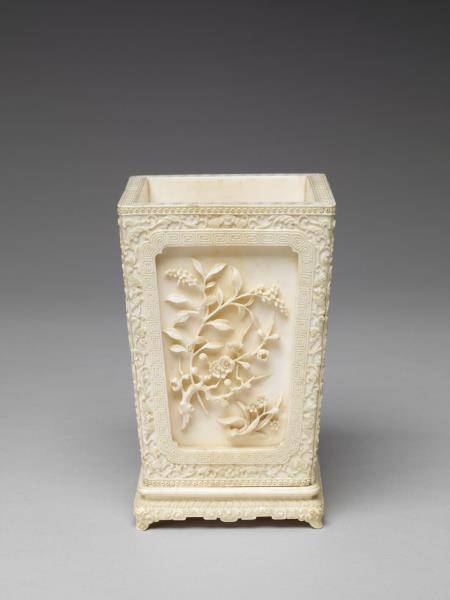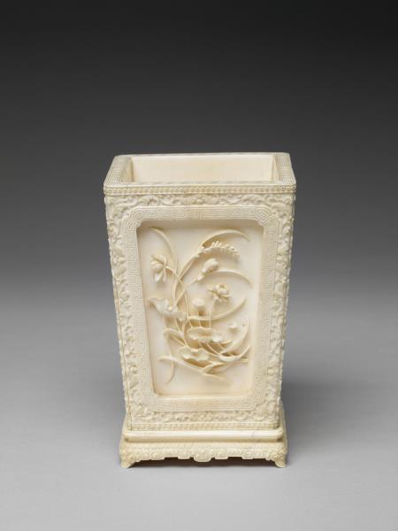 四方形,侈口,以象牙分別雕製四片筒壁及筒座後組合而成,以深淺浮雕及陰線刻製作圖紋,口緣頂端刻回紋邊飾,四周刻連珠紋,四壁中央有四邊形開光,內部分別以高浮雕刻菊花、蝴蝶紋,意寓「福壽」;蓮花、稻穗紋,意寓「連歲」;芙蓉意寓福氣;梅花、天竹、水仙有「仙祝吉祥」之意。開光圍以回紋邊框,外側飾蝙蝠、蓮花、海棠,座飾蓮瓣紋及如意雲紋,有四如意雲足。