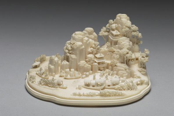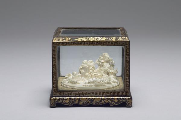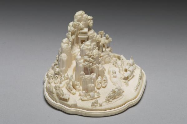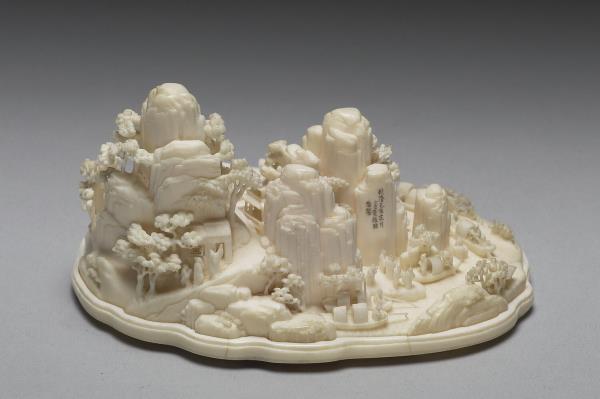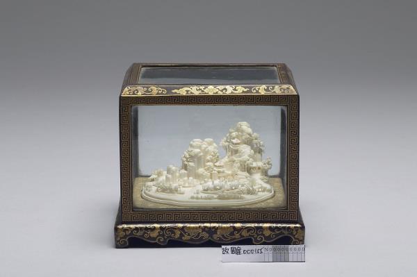 | 說明 | 全器以一塊象牙雕成立體山水人物小景,山勢陡峭,亭臺樓閣、小橋流水、茂密樹叢錯落其間,另有小舟九,或泊或泛;人物三十四,或坐於樓閣內,或立於山石汀渚,另有一組人在水邊高坡上團坐煮茗。沿著水岸,蘆荻叢生。山石背面陰刻填黑楷書款識:「乾隆己未花月,小臣黃振效恭製。」乾隆己未花月乃乾隆四年(1739)二月。黃振效是廣東地區牙雕藝匠,乾隆初期即入清宮內務府造辦處。 |