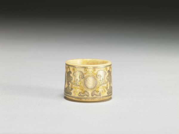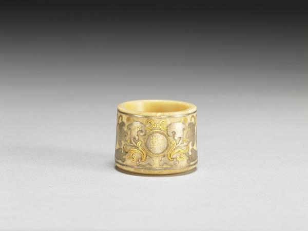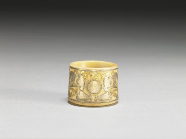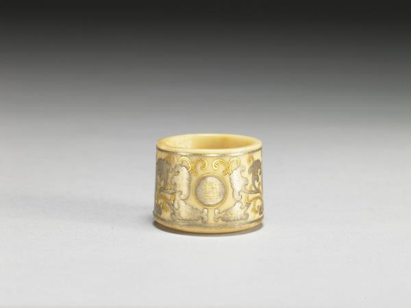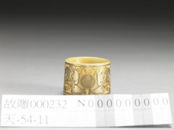 | 說明 | 雕牙骨嵌金銀絲扳指現存八件(故雕226-233),以金、銀絲鑲嵌如蟠螭、異獸、雲紋、龍獸紋或其他幾何紋樣為裝飾,每件器上皆有四個雙圈圖案,以篆書鑲嵌金絲「乾隆年製」或「乾隆御用」款。這套扳指以造型特殊的紫檀套蓋盒盛裝,外觀為三連獸足,套蓋上佈滿交錯的陰刻填金蟠螭紋,蓋內為三層盒,每層裝扳指三個。扳指本身的製作及外盒的雕工與造型設計,皆展現清代雕刻、金屬鑲嵌技術與包裝藝術的特色。 |