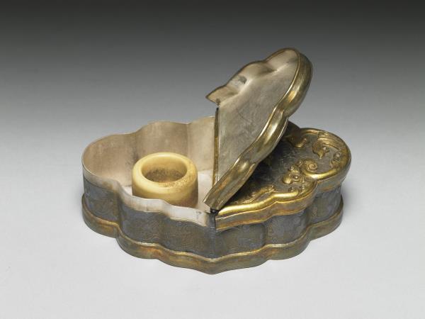 | 說明 | 扳指,又稱搬指、班指,是射箭時戴在大拇指上以鈎弦的工具,後來逐漸成為男性的裝飾品。扳指通常用玉等材質製成,滿人入關前或用虎骨、鹿骨扳指。本件骨質呈黃色,中央及邊緣略呈褐色或粉紅色,保留扳指樸質的本色,收貯於銀鍍金流雲寶相花雙聯盒中,有特殊珍藏之意。 |
