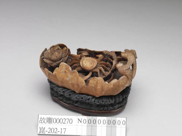| 說明 | 竹根以立雕方式雕製,整體雕成一半圓形的荷葉,中間盛一隻螃蟹,螃蟹左側為一朵盛開的蓮花,右側有一支稻穗,兩隻麻雀站在荷葉邊緣,一隻展翅搭在另一隻肩上,像是對話一般。以陰刻細膩刻畫麻雀的毛羽、荷葉葉脈等紋理,形象活潑生動,並搭配一水波紋木座。荷花與螃蟹諧音「和諧」,是吉祥圖案的題材之一。 |