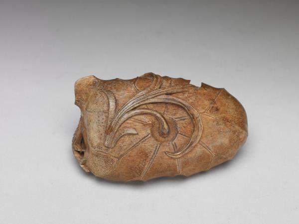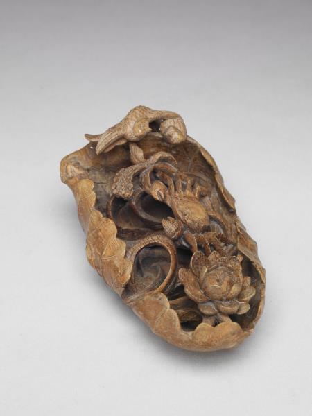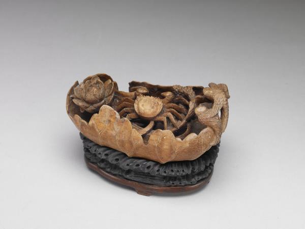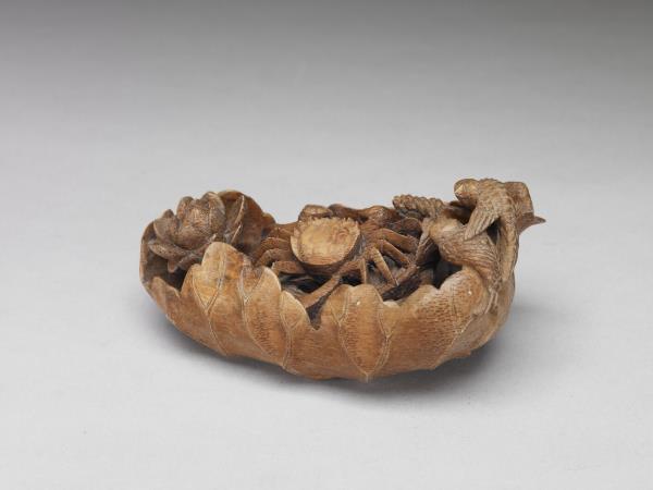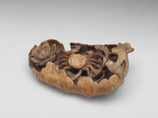Carved bamboo water holder in the design of a lotus leaf and crab |