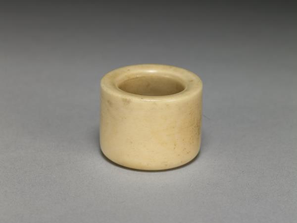 牙白色象牙質扳指,帶少許黑色雜斑。器壁厚,呈短管狀,全器內外光素無紋。