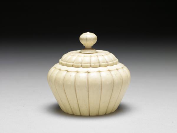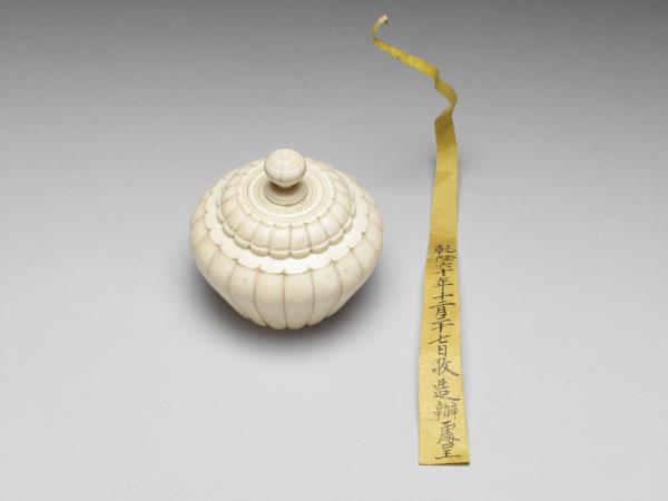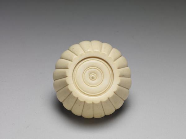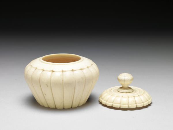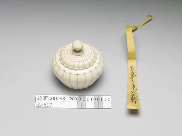以象牙雕刻而成之蓋罐,全器周身雕刻成菊花形,蓋亦呈菊花式。此器斂圓口,斜肩,腹上豐下斂,平底。底部刻有多圈同心圓。蓋頂帶一圓球鈕。口緣邊雕飾一圈花瓣紋。