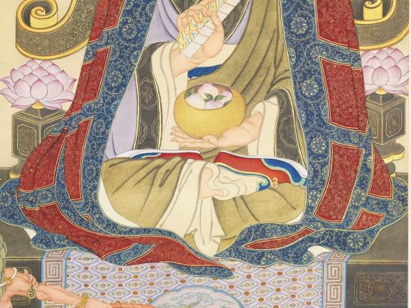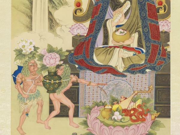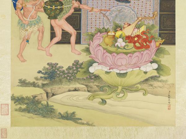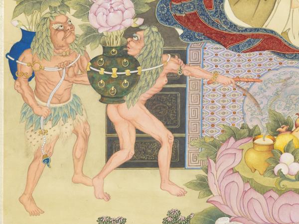 第十二畢那楂拉哈拔喇錣雜尊者。見食如石。訖不能食。豈不腹枵。意度則惑。池出蓮花。供養具足。二鬼負花。怒𥅠其目。 |