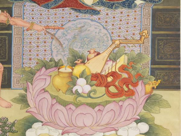 經冊、缽、琵琶、蓮花供台、寶珠 |