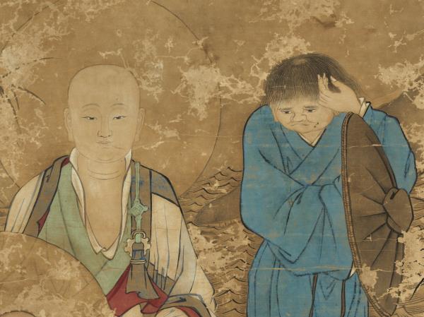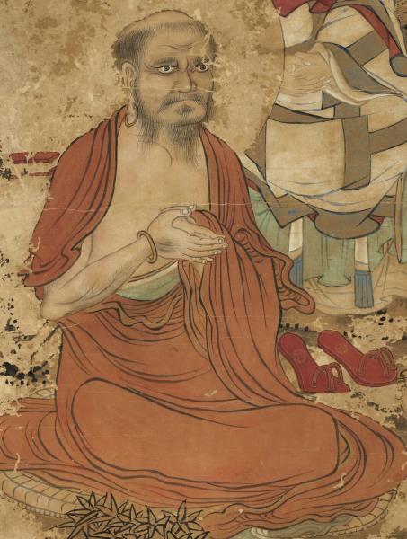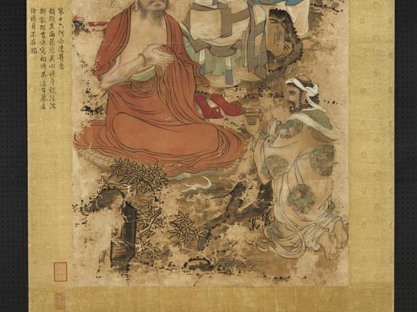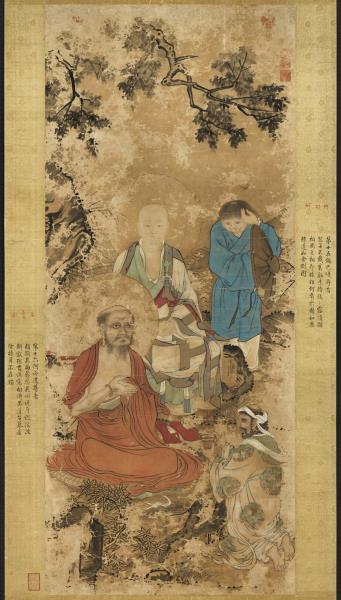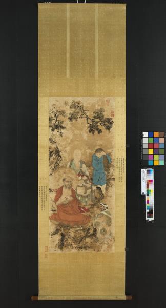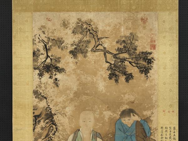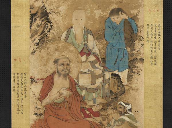 (裱綾藏書標名。朱書。下為行楷書題名。第十五鍋巴嘎尊者。第十六阿必達尊者。每尊各有行楷書四言贊一首。贊文不錄。) |