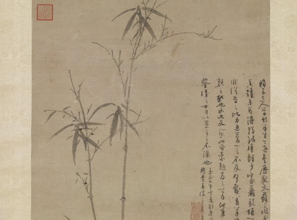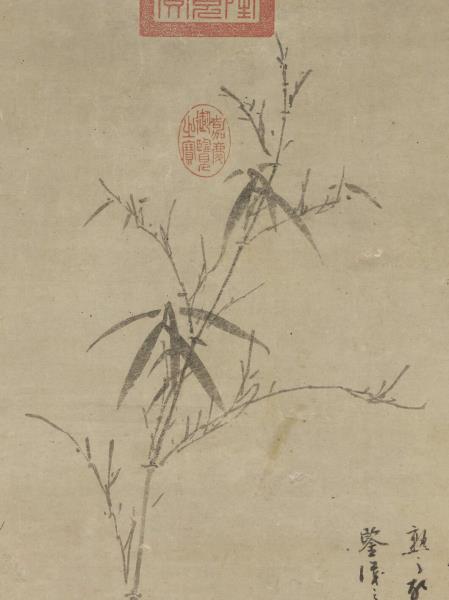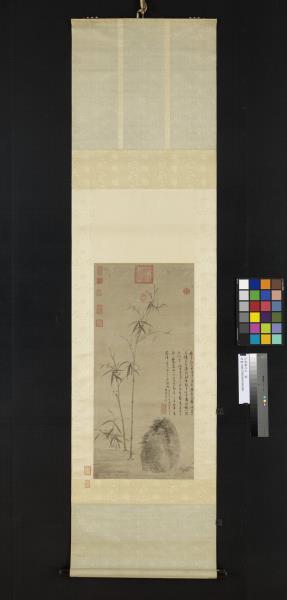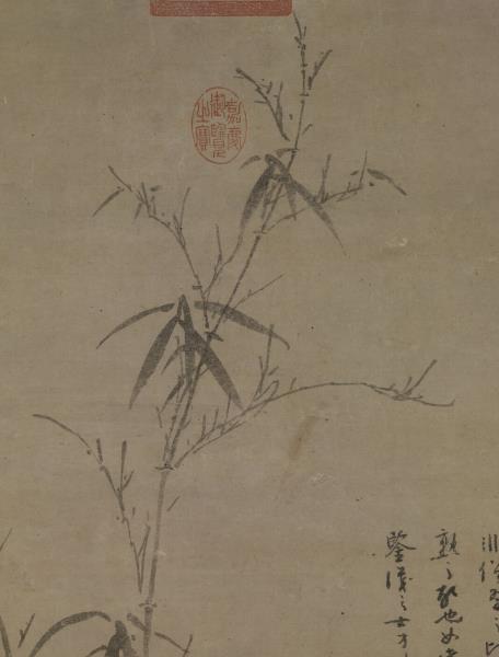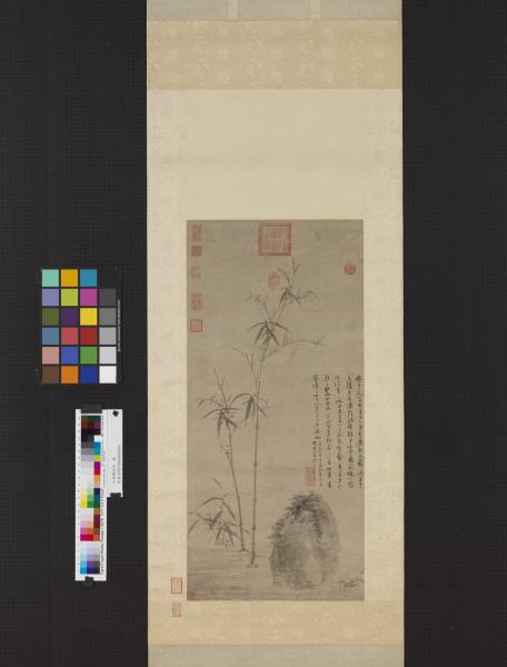 吳鎮存世之作幾為墨畫,晚年墨竹作品尤為多,由於作品上留有大量的題語,顯露出個人繪畫思想乃至一生學養,【註2】其中又以<竹譜冊>為著。元代由於大環境的改變,文人好寫「三友圖」,以松竹梅表達象徵意義,【註3】或寄託情懷,吳鎮亦有言「墨戲之作,蓋士大夫詞翰之餘,適一時之興趣也」。【註4】然審視此軸,實為筆墨?熟之瀟灑佳作,非僅一時隨興之墨戲。竹幹、岐枝皆下筆圓健,竹枝勁利,稍帶迴鋒,儘管分枝多、發葉少,但葉隨枝生,生態盎然;淡墨石以臥筆混點。幅中之墨色皆不濃重,顯現一種平淡沖和的色感。竹石間,吳鎮以流暢有力,墨色較濃重的行筆題下款識,畫面益顯沈穩。和<竹譜冊>相較,此圖乃其精心之作。(張華芝)
