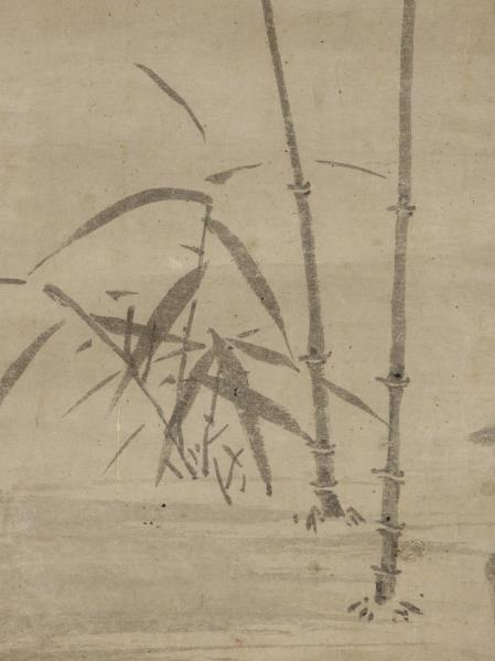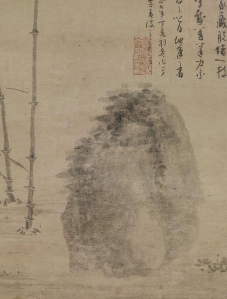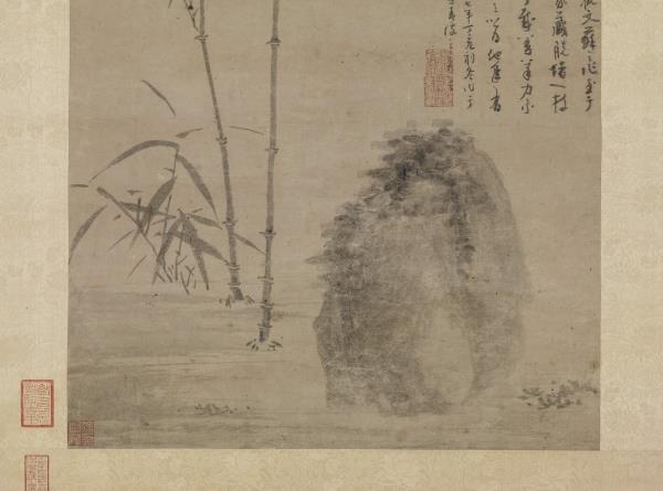 Wu Chen (style name Chung-Kuei; sobriquets Mei-hua-tao-jen, Mei-sha-mi) was a native of Wei-t'ang, Chia-hsing, Chekiang. One of the Four Masters of the Yuan dynasty, Wu Chen was noted for his paintings of landscapes, ink flowers, and bamboo and rocks. He was also skilled in writing literary compositions in cursive style. In painting landscapes he followed the Five Dynasties artist Chu-jan. This painting, executed when Wu Chen was sixty-eight years old, depicts a rock and two stalks of bamboo. Though the artist used little ink, he attained a masterful spirit which could not be surpassed in a more complex composition.