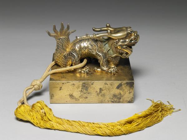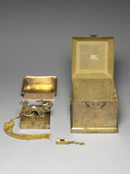 | 說明 | 銅鍍金製方形印璽,印鈕作龍紋,繫黃縧,印身周邊光素,印面雕篆書及滿文:「榮惠皇貴妃之寶」。帶銅鍍金盝頂印匣,內有一銅托,另附一鎖。榮惠皇貴妃為清穆宗同治皇帝的妃嬪,西林覺羅氏,同治十一年初封瑨貴人,十三年進為嬪,光緒二十一年間晉封為妃,三十四年尊封為皇考瑨貴妃。遜國後,民國二年,加封為榮惠皇貴妃;十一年溥儀婚後稱為太妃,民國十三年溥儀出宮後不久,於十一月二十一日出宮,移居榮壽固倫公主(恭親王奕訢長女)家。 |